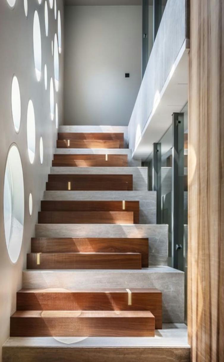 Selon le type de source utilisée et son orientation, l'éclairage peut ainsi servir à mettre en valeur votre escalier en mettant en lumière la beauté de ses matériaux. Selon les couleurs et formes de projection choisies, l'ambiance et le style créés peuvent varier.