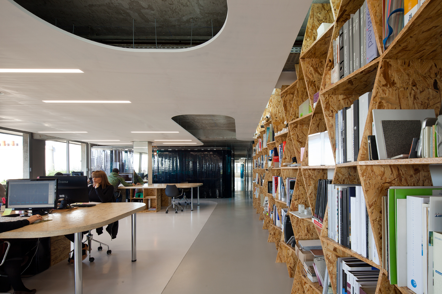 Il y avait dans un lot de bureaux encloisonnés, répondant au cahier des charges de l’époque de construction du bâtiment, à savoir les années 70. Nous avons voulu concevoir un espace libre où l’intéractivité entre collaborateurs serait facile. Nous avons donc mis à nu le plateau. Nous avons retiré tous les faux plafonds existants et laissé place au béton brut. Puis nous avons conçu de grands plateaux en OSB vernis pour les postes de travail. La salle de réunion et la salle impression / serveur ont été séparées par des rideaux en pvc utilisés d’ordinaire dans l’industrie frigorifique.