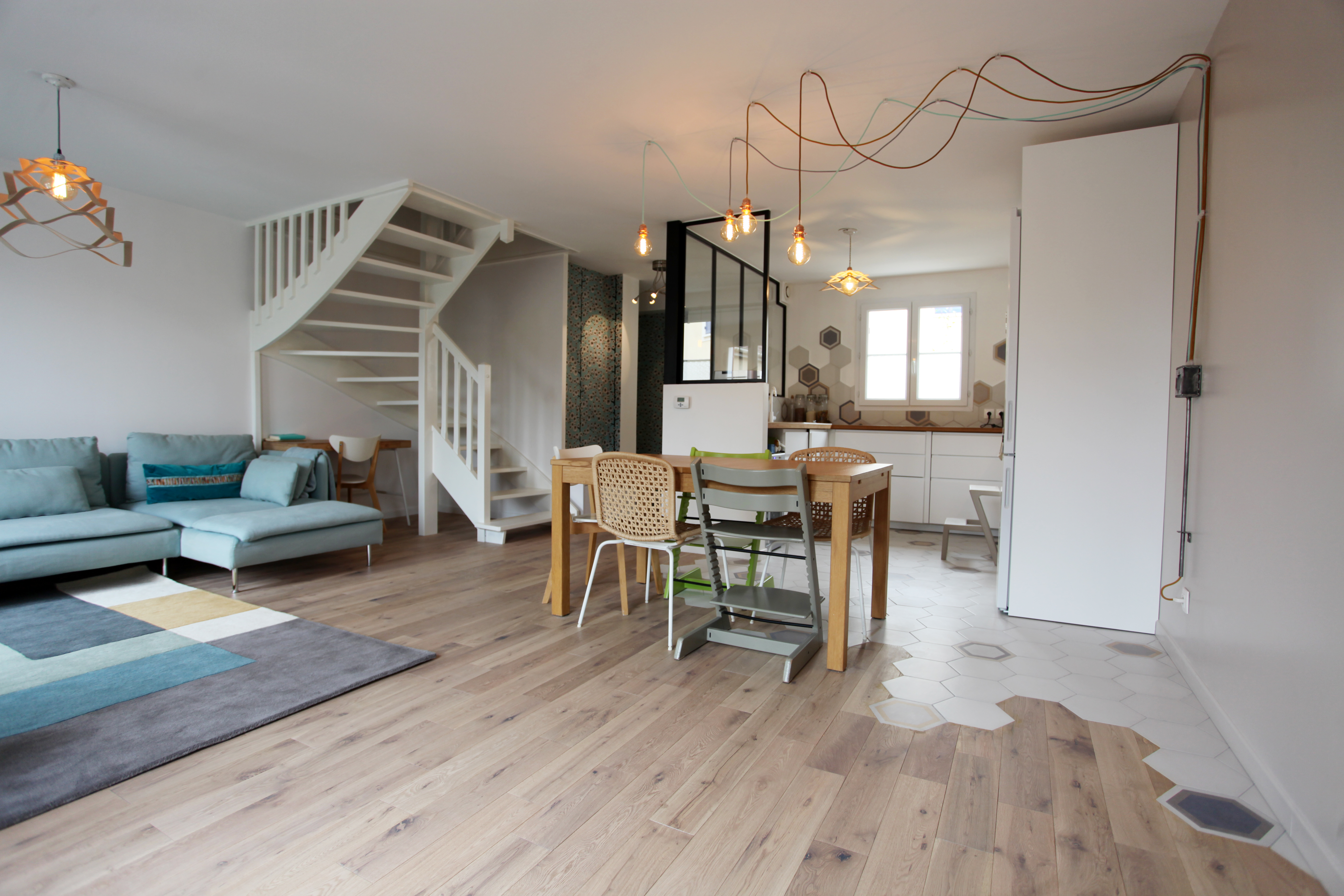 Restructuration de l’entrée, de la cuisine et du salon avec une verrière pour apporter d’avantage de lumière au RDC. L’espace de vie parait plus grand, plus fonctionnel et plus chaleureux.