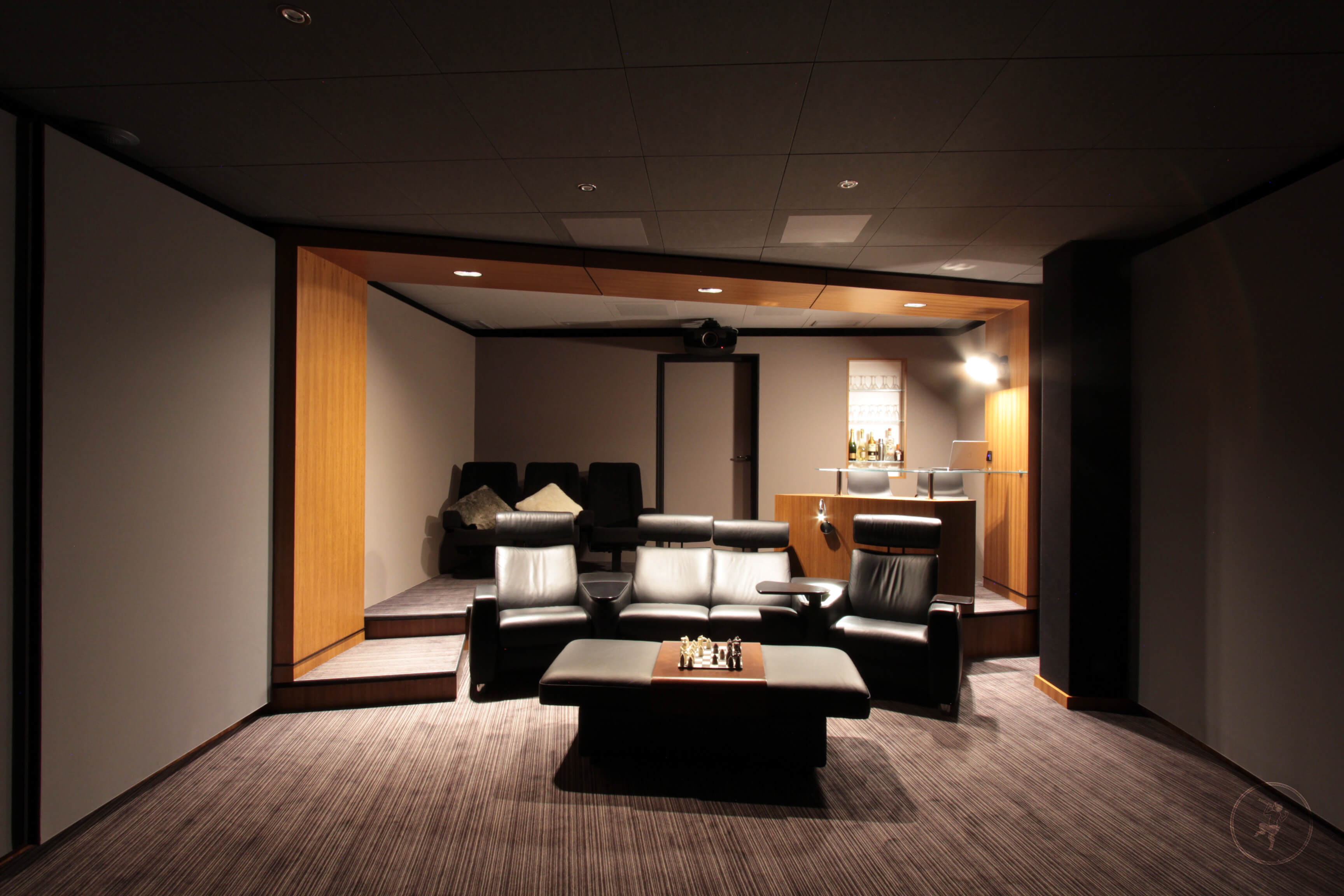 L’arche cadre sur l’écran et propose une zone de vie innovante. Un espace bar est rétroéclairé. L’arche réalisée en bois zébrano déstructure la pièce, au format souvent cubique et parfois oppressant. La pose aléatoire de la moquette renforce cet effet visuel. Sur les ailes de la pièce, nous avons désaxé les panneaux acoustiques pour insérer de manière invisible les bandeaux LED. Outre la prouesse technique pour intégrer le système de son et la vingtaine de combinaisons lumineuses, cette salle de cinéma permet de gouter à des sensations inédites qu’aucun cinéma grand public ne peut procurer.