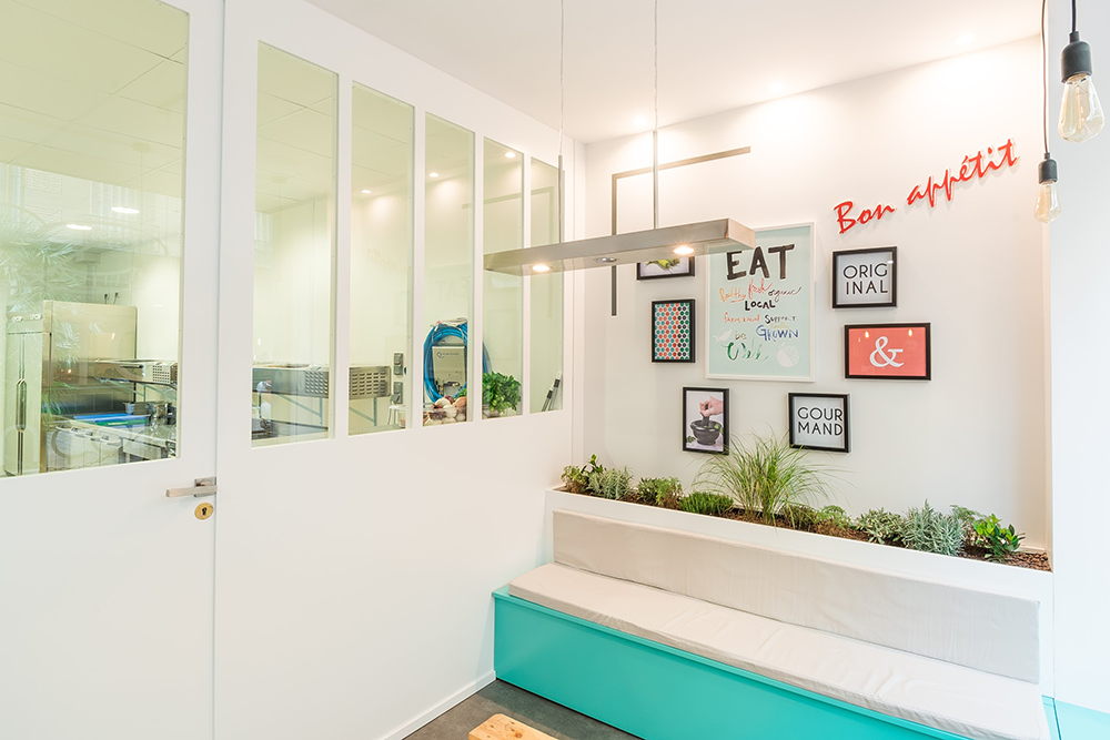 Prestation sur-mesure : - Conception de l'ensemble du projet d'agencement - Décoration de l'ensemble du local en créant deux zones : une zone chaleureuse pour l'accueil des clients, et une ambiance plus végétale côté laboratoire de cuisine - Coordination de chantier : de l'appel d'offres à la réalisation des travaux