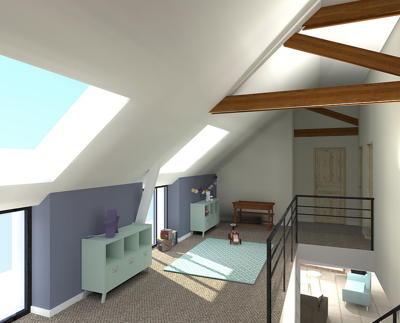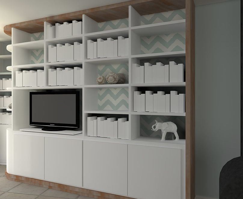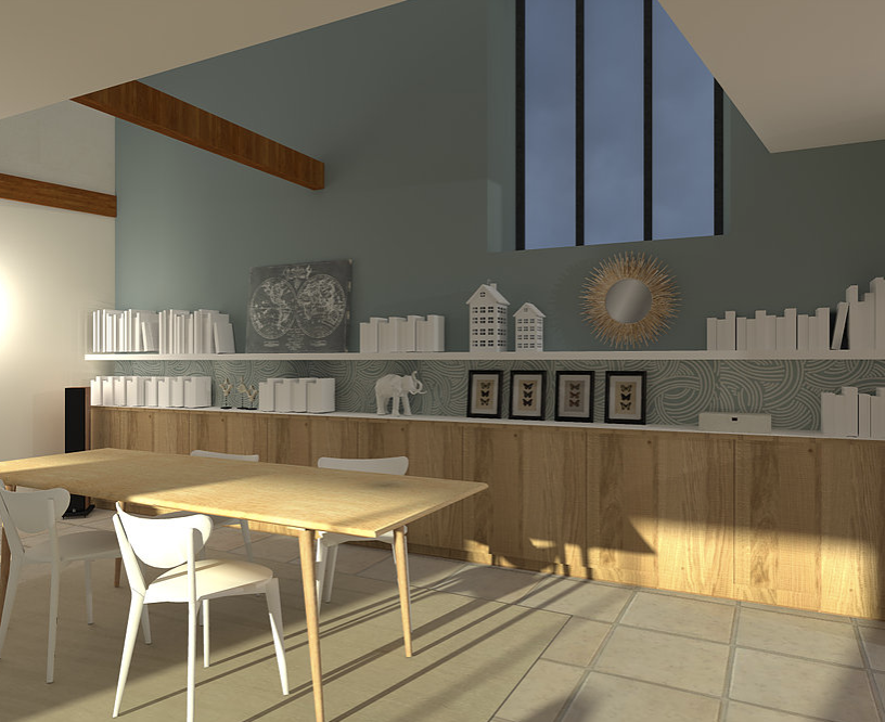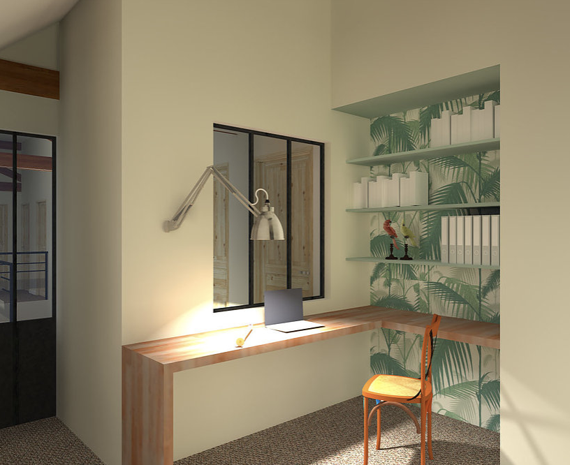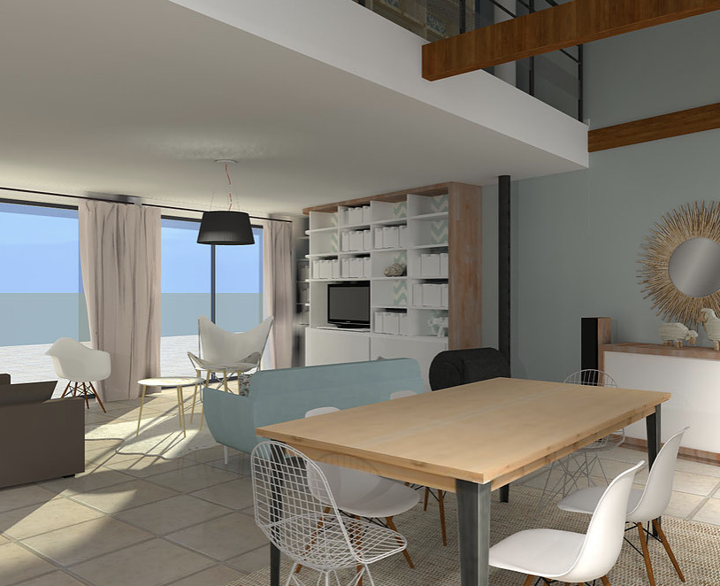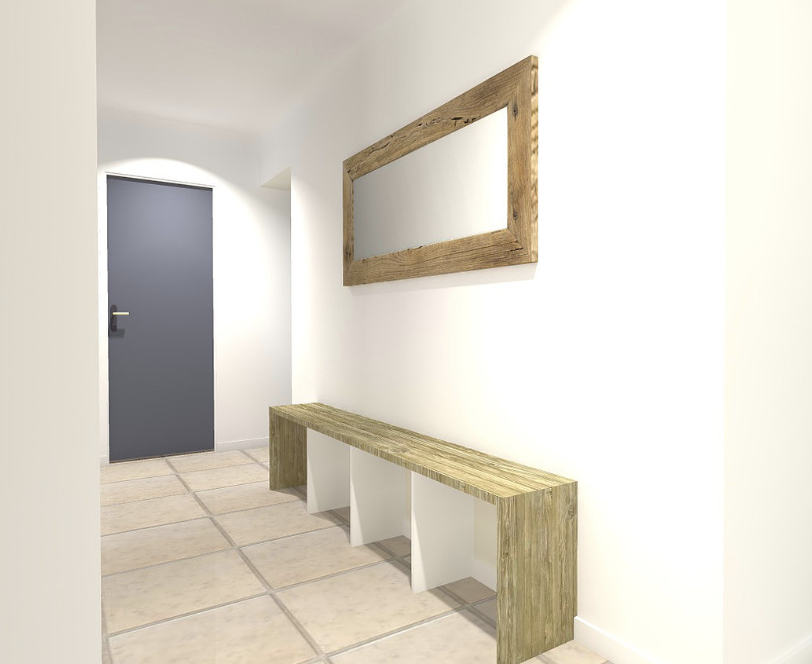 Objectif: redéfinir les espaces de vie, désencombrer et optimiser les rangements. Cette mission présente 2 propositions d'aménagements: la première prévoir du mobilier sur-mesure et la seconde uniquement du mobilier proveant de grandes enseignes. Voici la 1ere proposition.