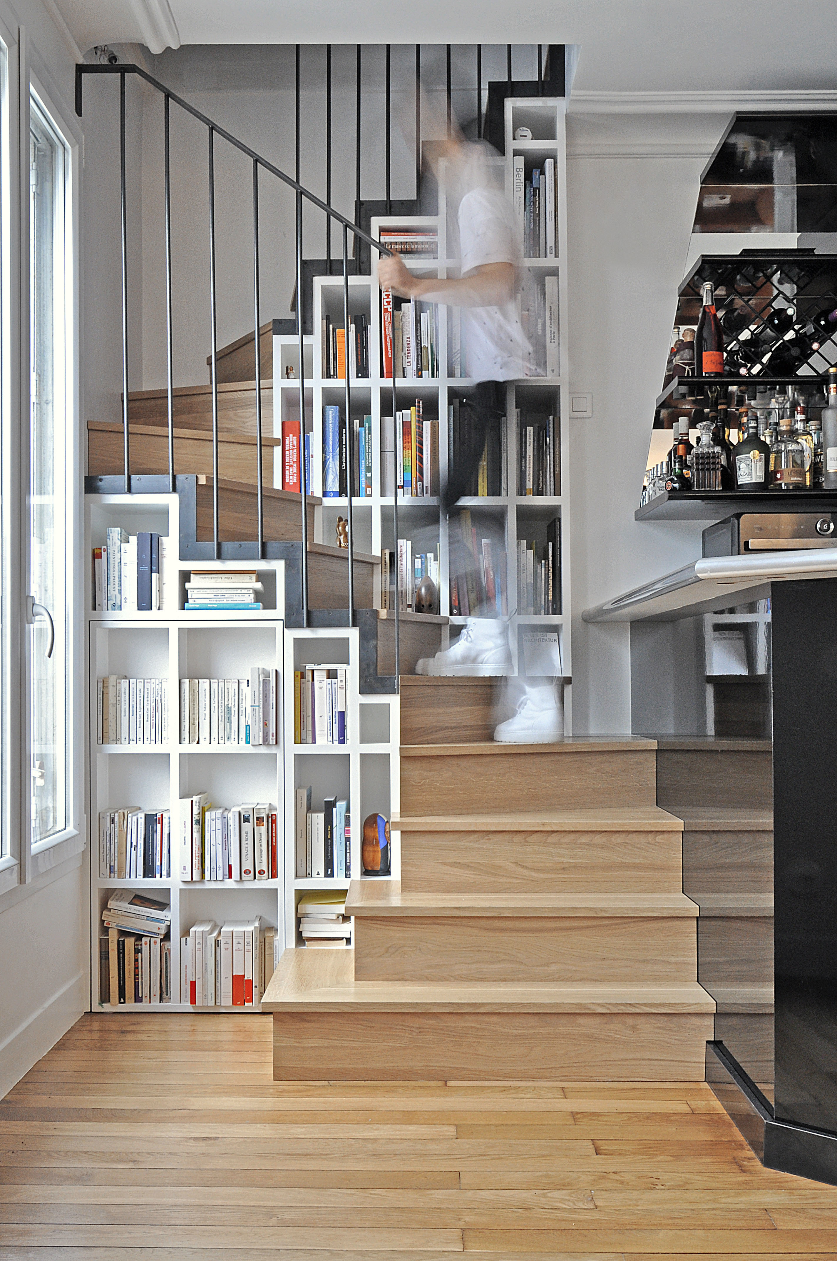 Cet escalier bibliothèque est réalisé sur une structure en MDF peint avec les marches et contremarches en chêne massif. Les garde-corps sont fait sur mesure en acier patiné posés à l’anglaise sur une crémaillère qui souligne la transition entre le chêne et le blanc.