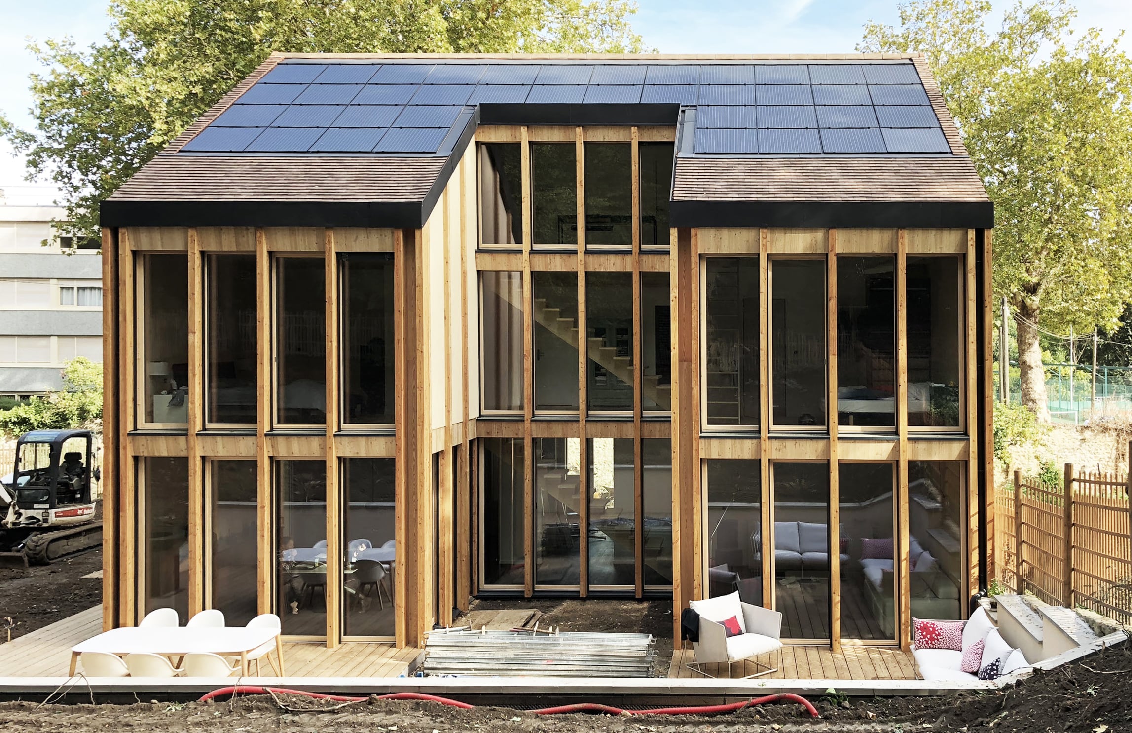 Construction d'une maison en CLT, structure bois, avec un faible impact environnemental et hautes performances énergétiques.