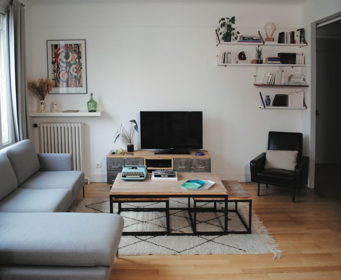 Agencement d'un écrin neutre sublimant le mobilier et les objets existants, création d'un salon et d'un atelier de peinture dans un esprit arti et vintage.