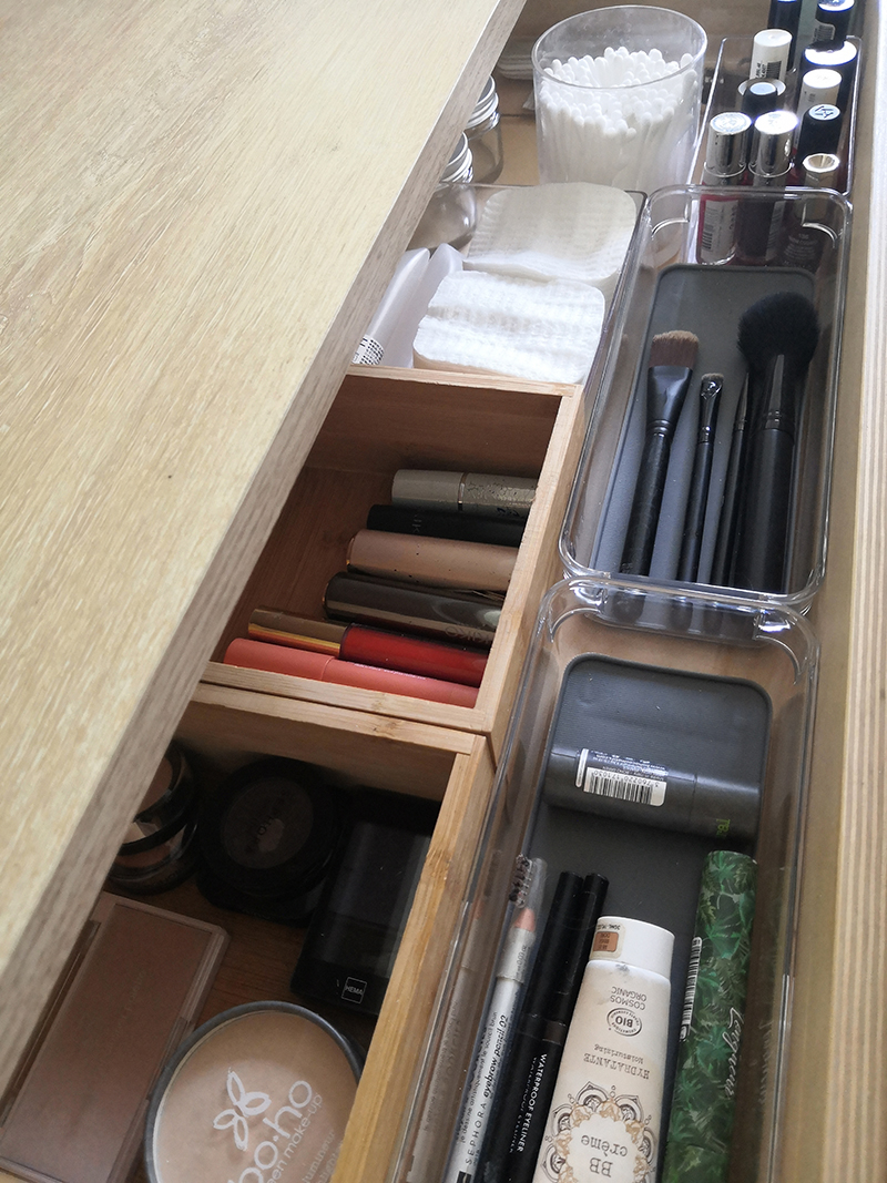 Le meuble sur-mesure offre une grande capacité de rangement tout en s'intègrant parfaitement au couloir menant à la zone d'eau. Il donne de la perspective à l'ensemble.