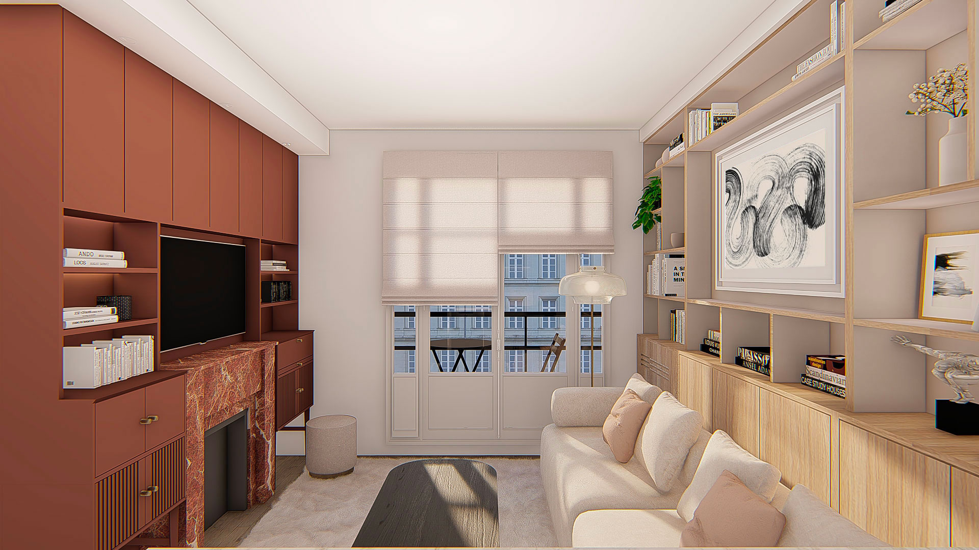 Le choix de la couleur terracotta pour le meuble autour de la cheminée créé un élément fort qui donne du caractère au séjour