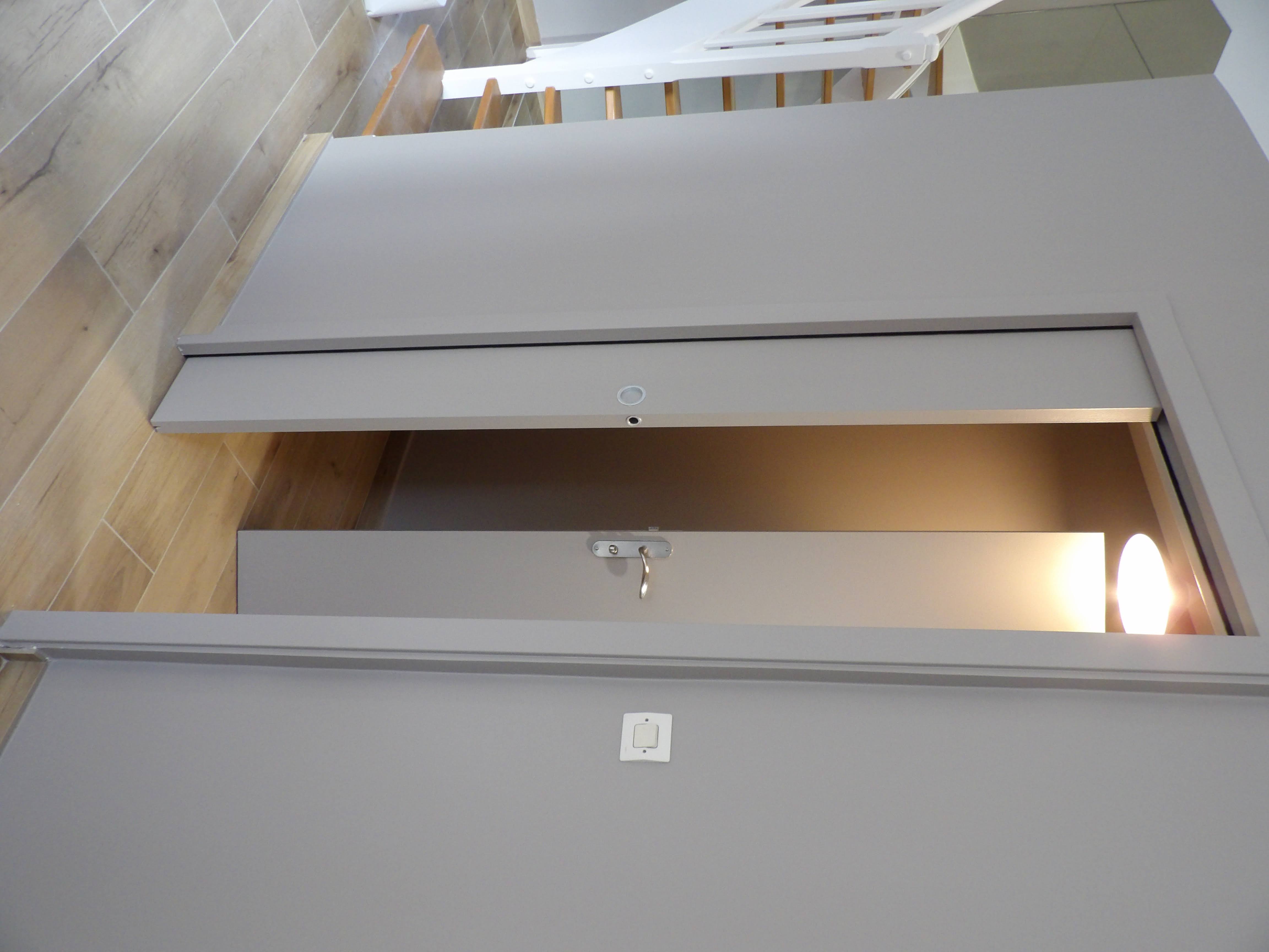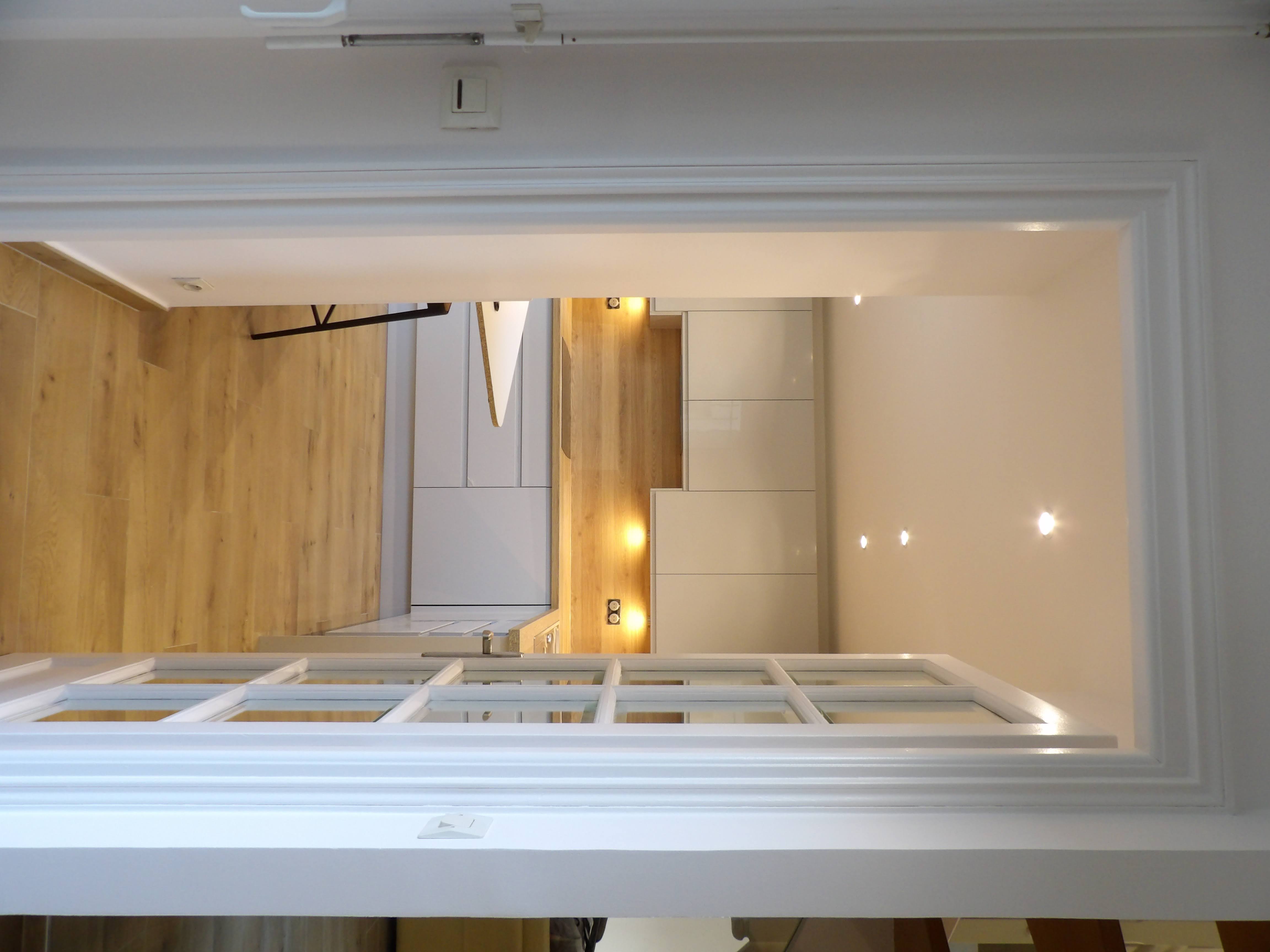 Rénovation complète, entrée, salon, salle à manger, cuisine et escalier.