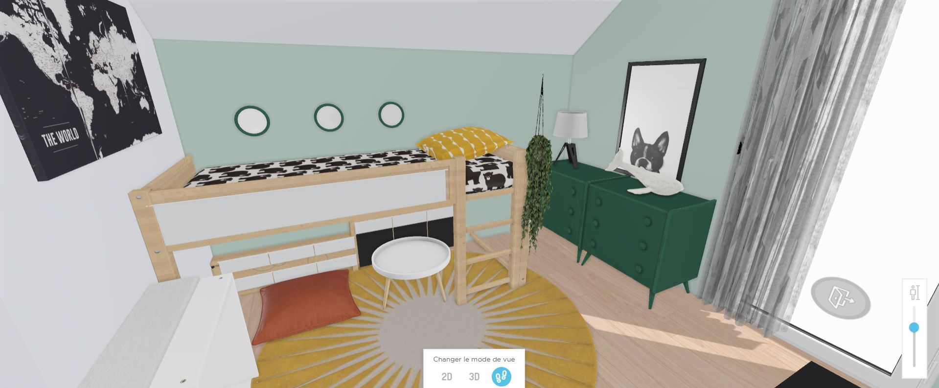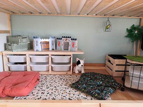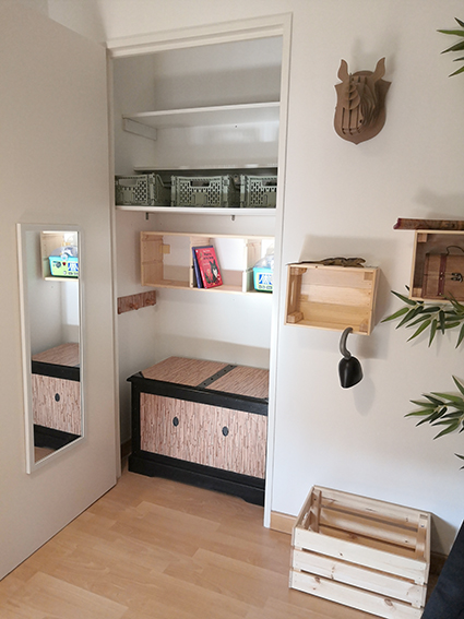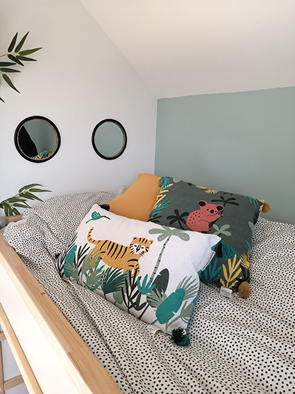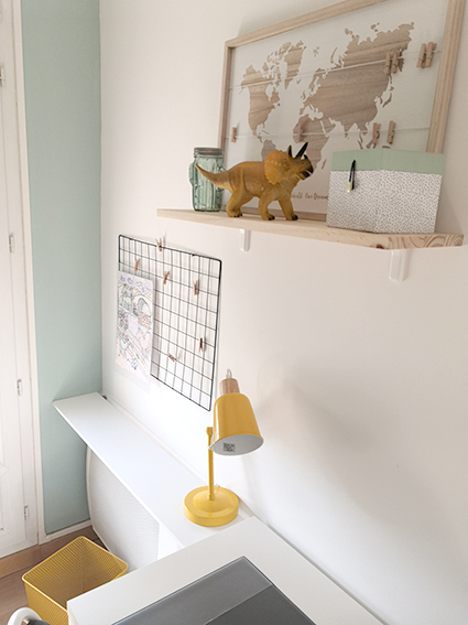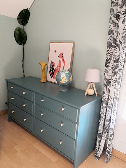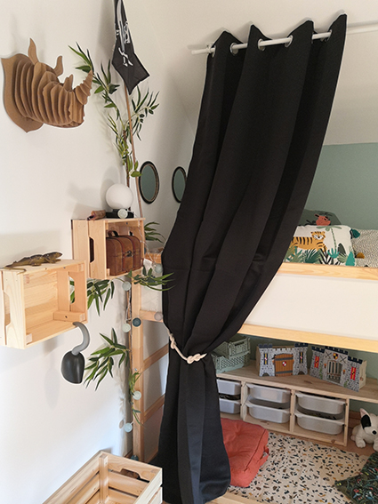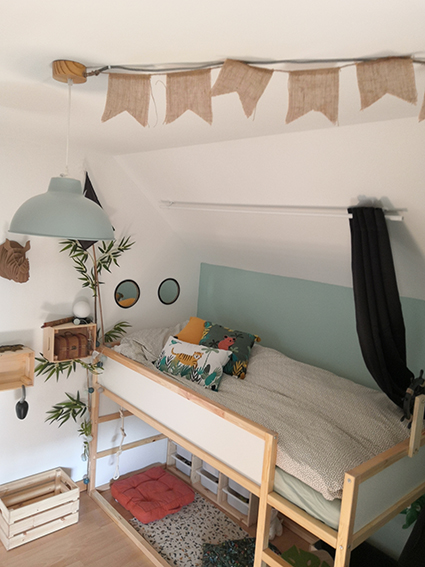 Rafraîchissement de la pièce en répondant aux thèmes pirate et animaux et en intégrant la couleur préféré du garçon : le vert.