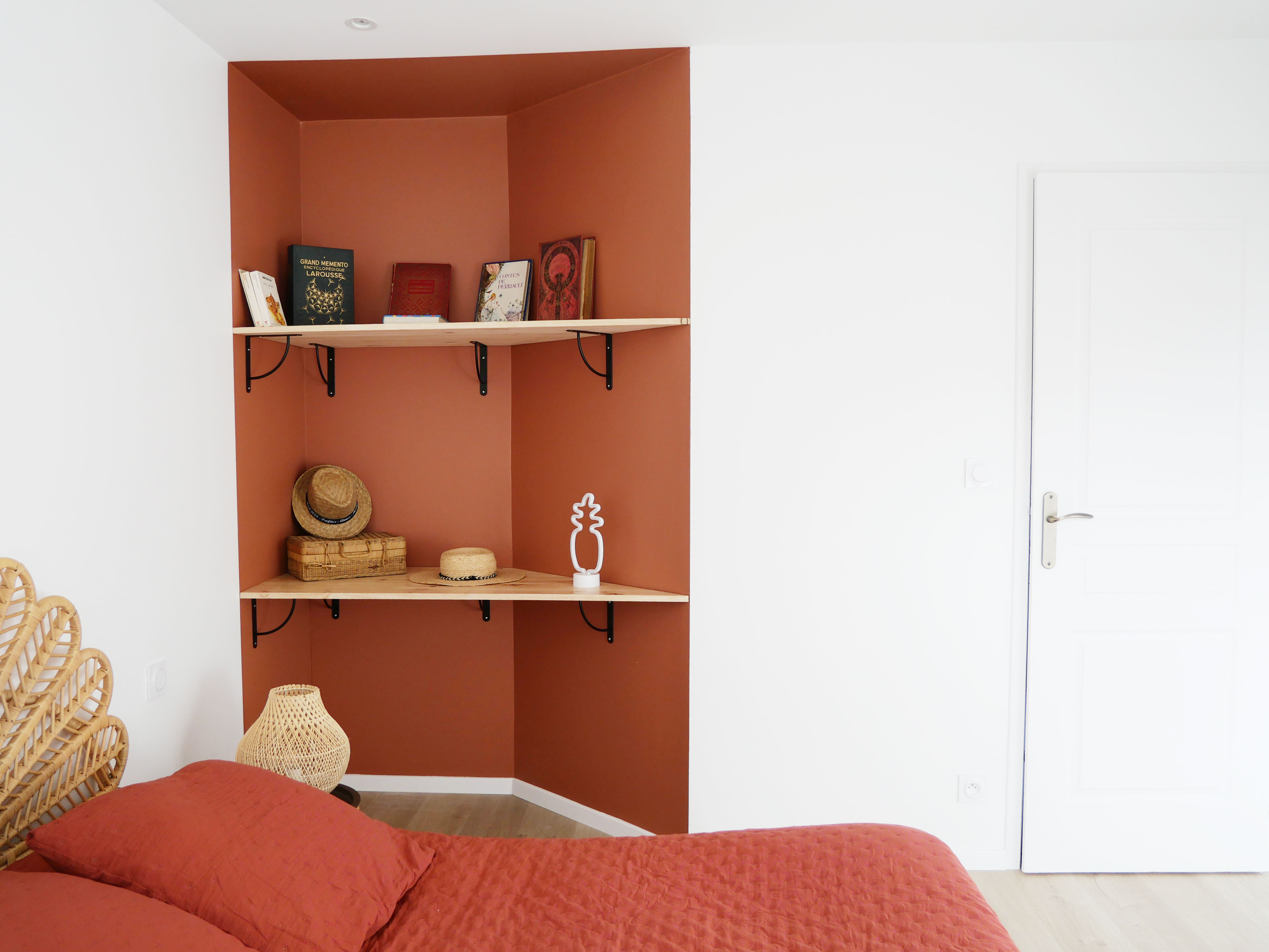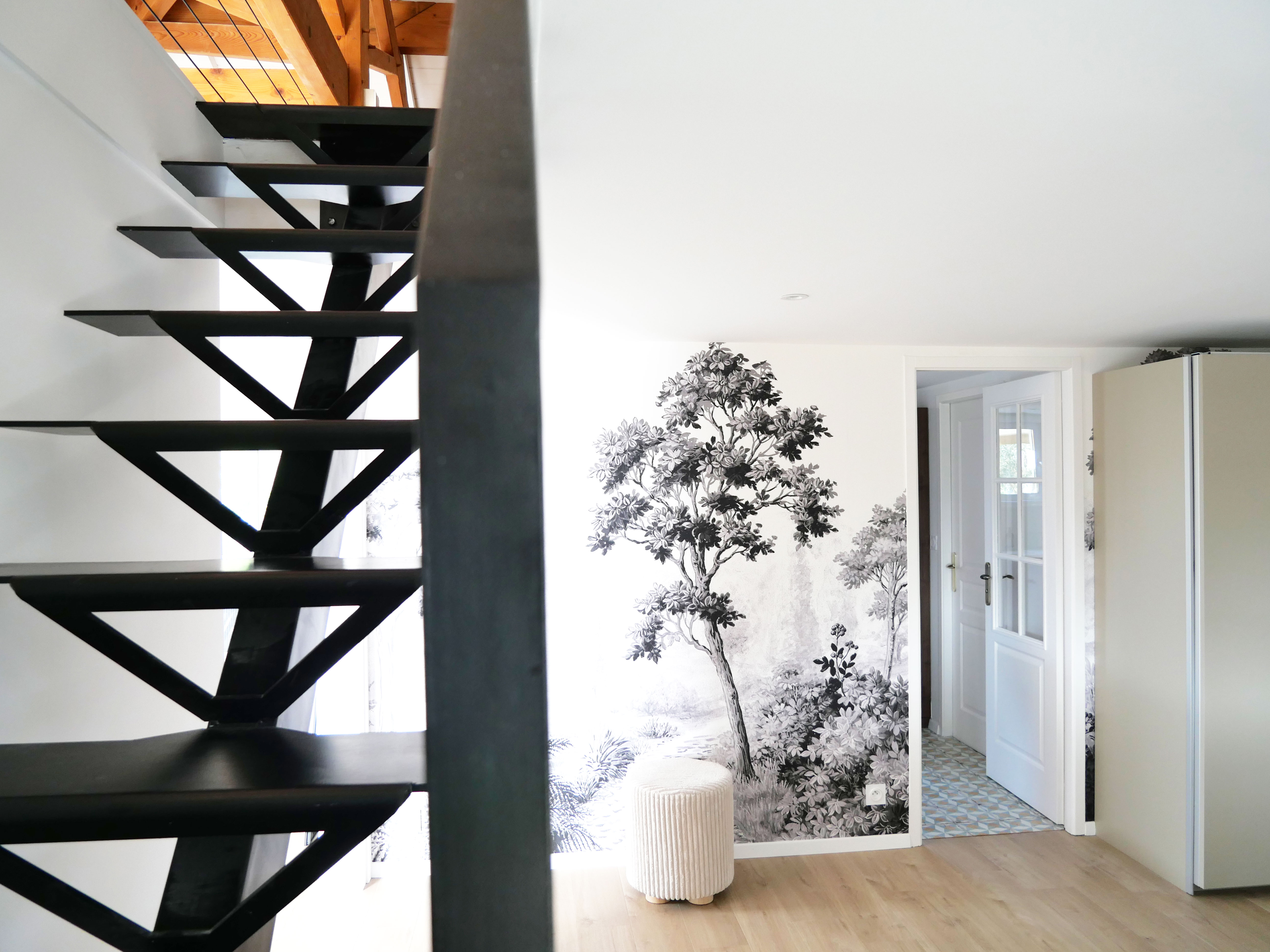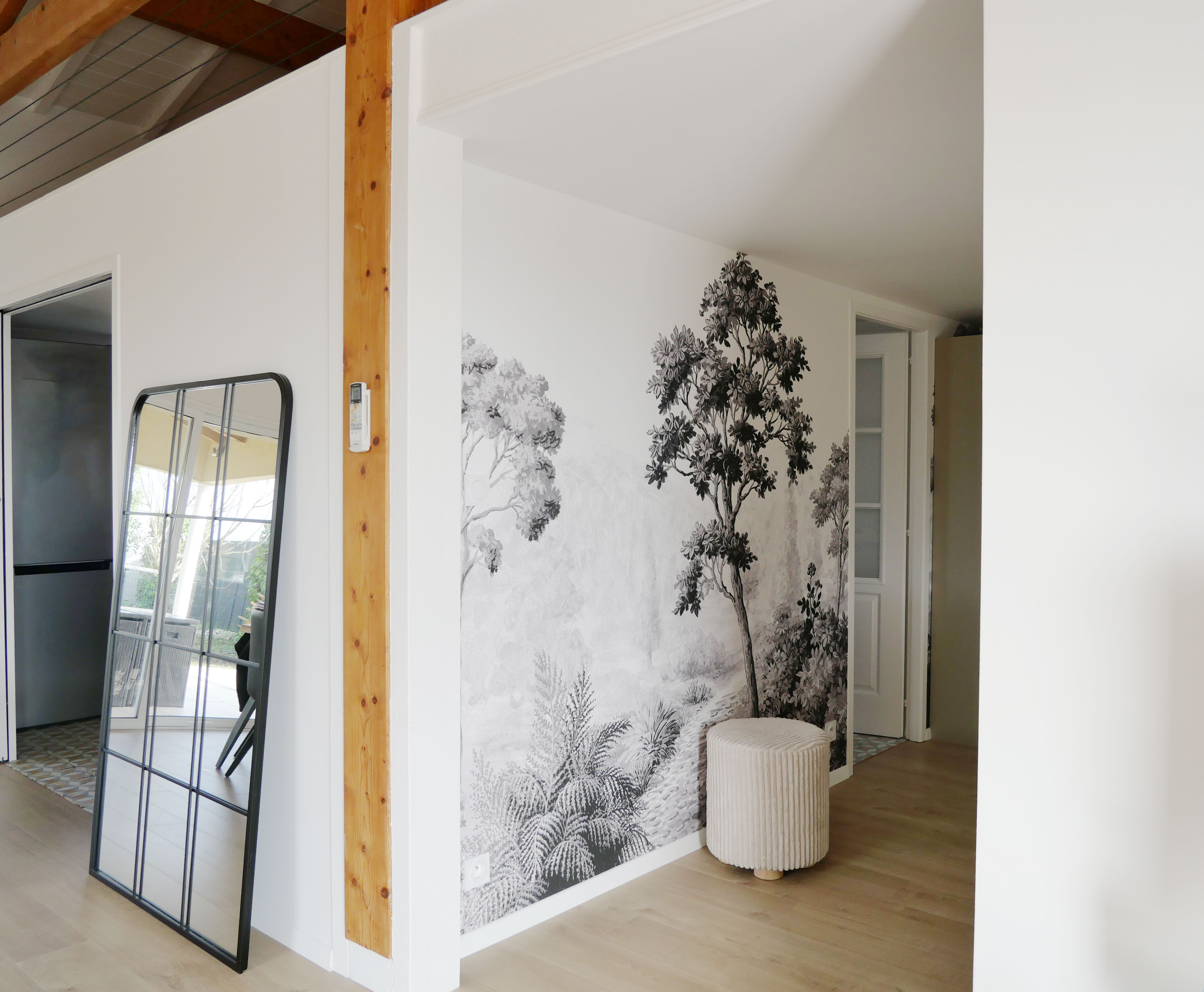 Nouveaux venus dans la région, mes clients ont fait appel à moi après l'achat d'une maison dans la région du Grave. Il s'agissait d'une maison de 154 m² avec une charpente en bois apparente, orientée à l'est. Leur souhait était d'avoir une maison avec de la couleur et des touches d'originalité.