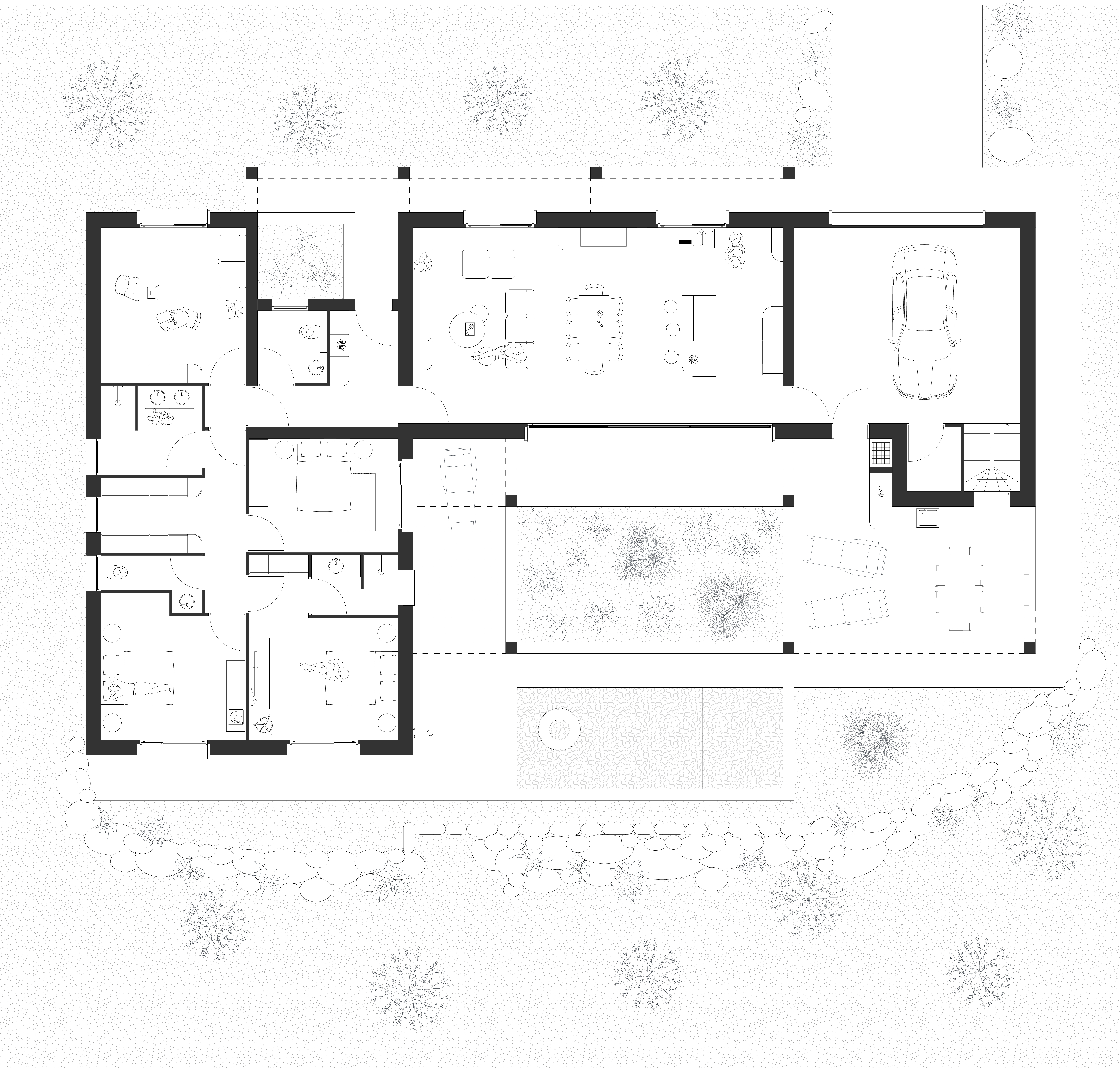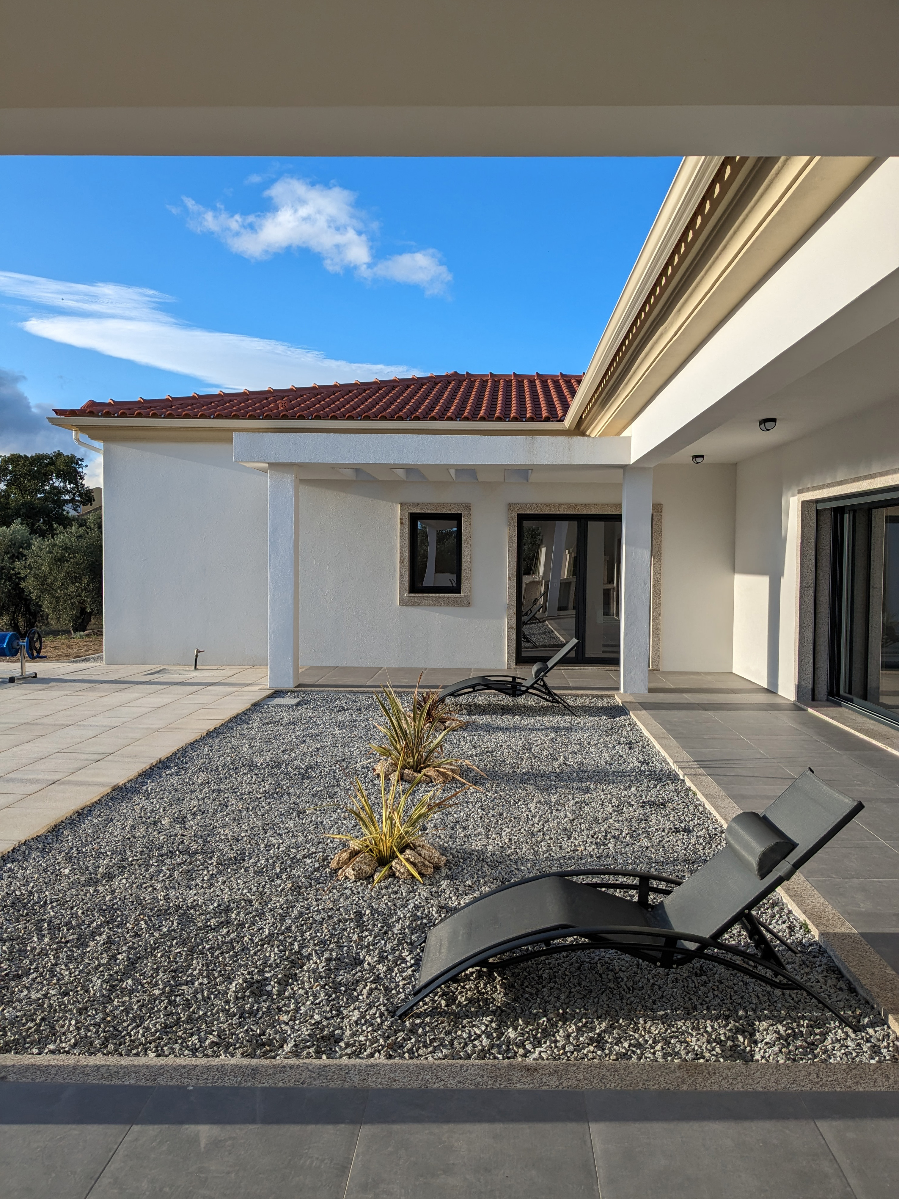 Cette maison de plein-pied, dissimulée par des oliviers centenaires, s'inscrit sur un lit de granit dans la pente du terrain, en toute tranquilité pour le voisinage. Elle conjugue un vocabulaire contemporain et rural, pour s'adapter aux ressources et savoir-faire disponibles dans la région. Les tuiles canal, ses façades en enduit blanc, le granit jaune et le chêne local font écho au patrimoine de la région. Quelques touches de couleurs à l'intérieur rendent hommage au paysage, comme le vert olive, le bleu piscine, le sable aride et la terre cuite.