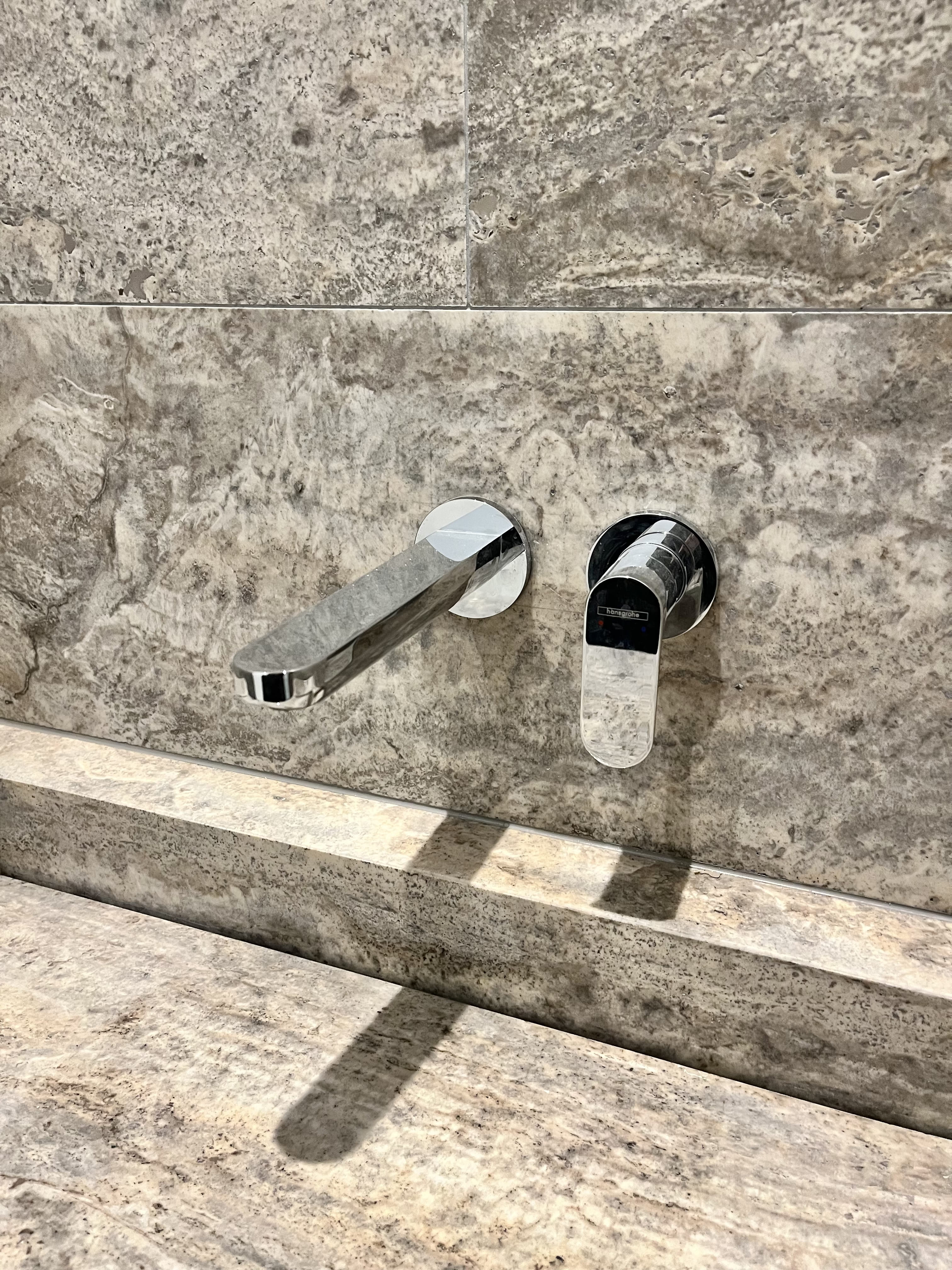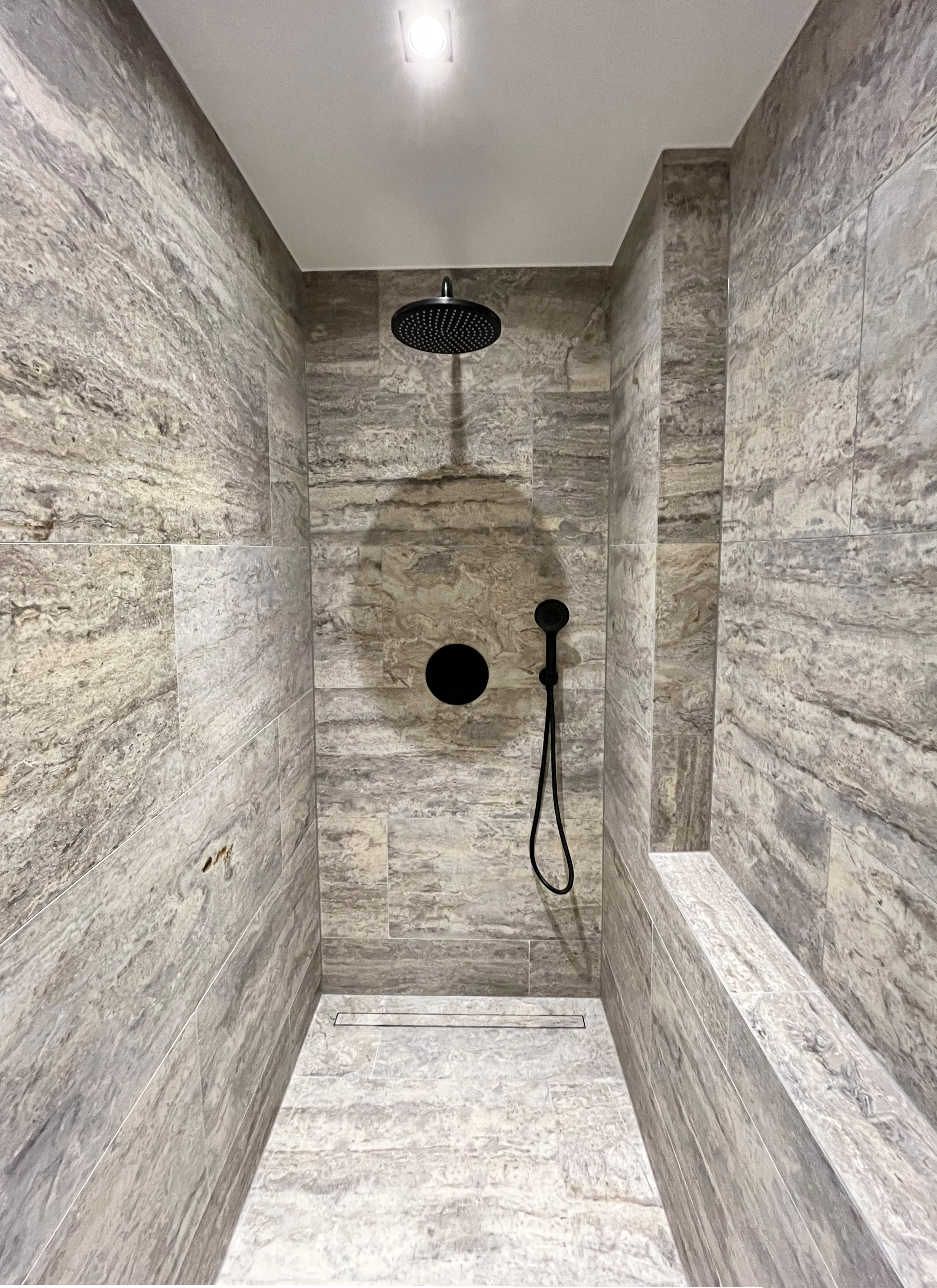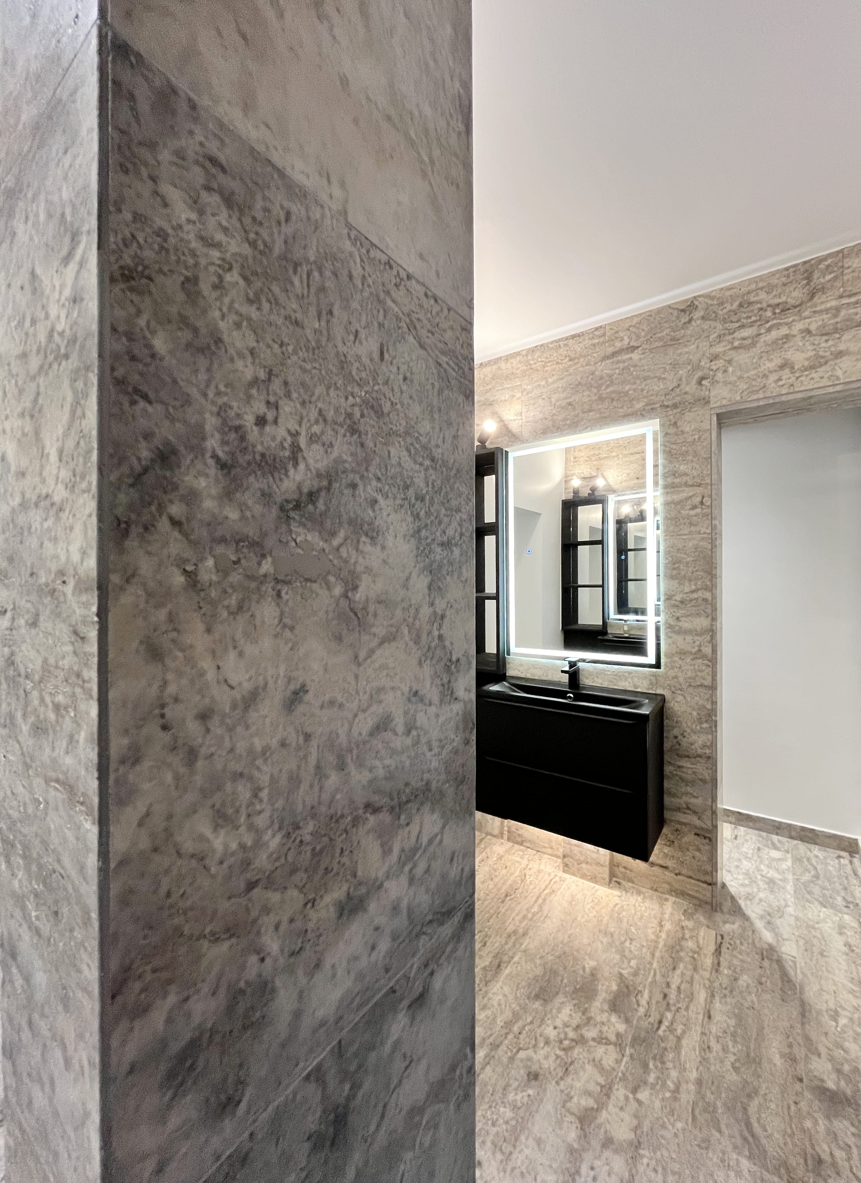 Rénovation de deux grandes salles de douche dans un style très contemporain et minéral, avec le placage de grandes dalles épaisses de Travertin Silver.