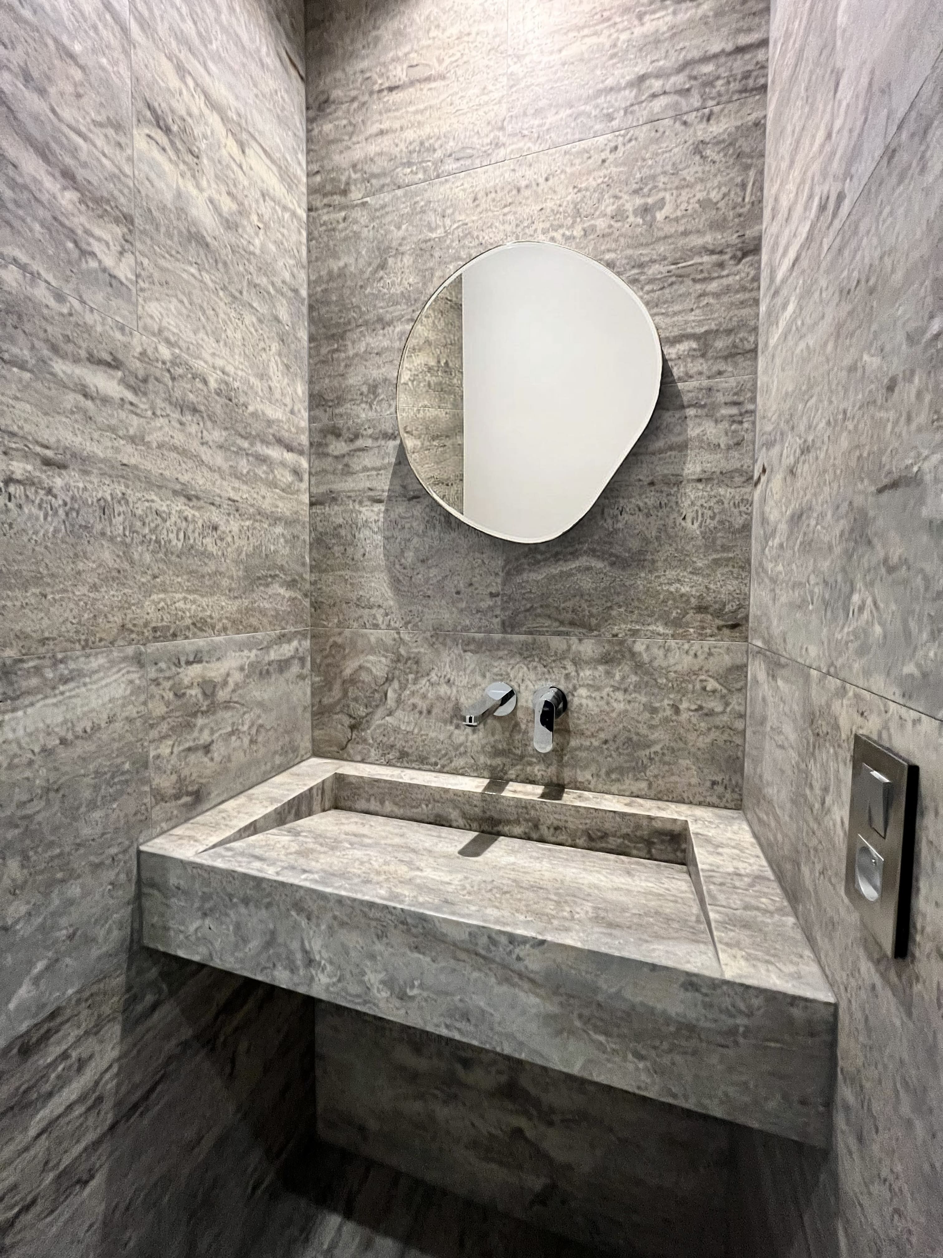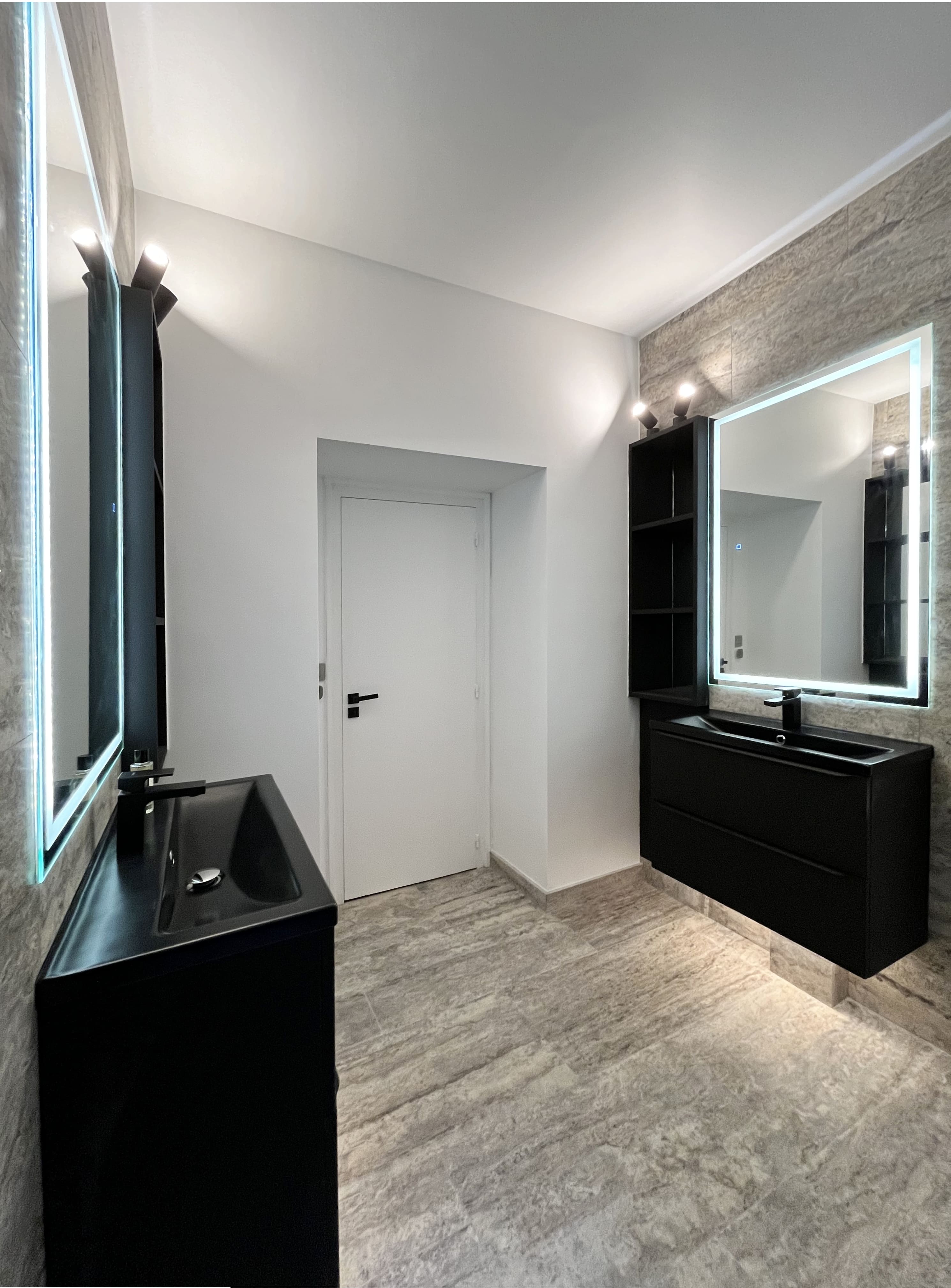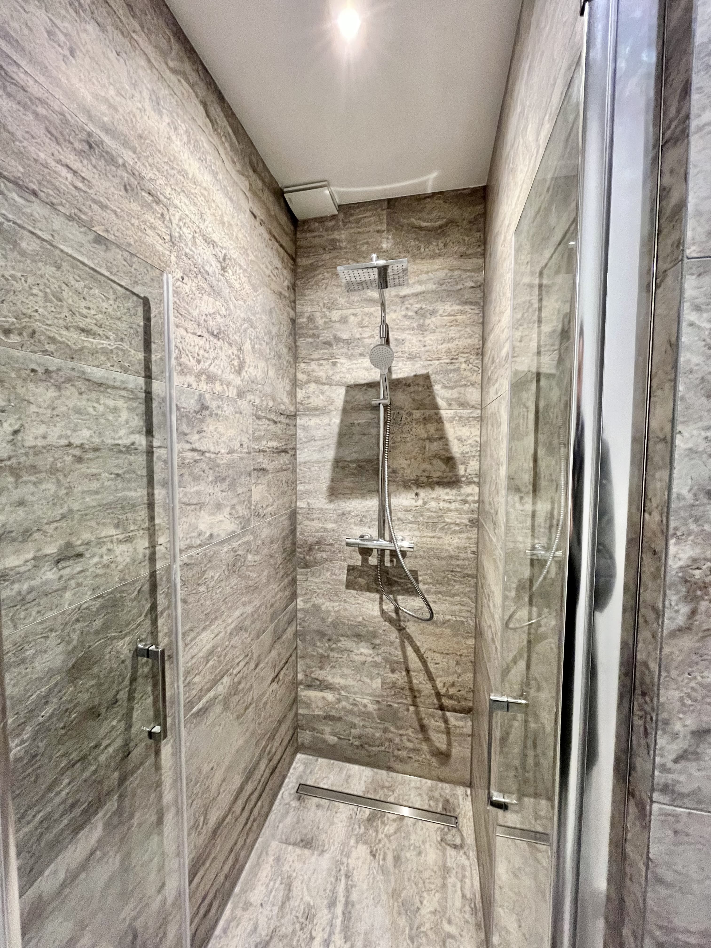 Rénovation de deux grandes salles de douche dans un style très contemporain et minéral, avec le placage de grandes dalles épaisses de Travertin Silver.