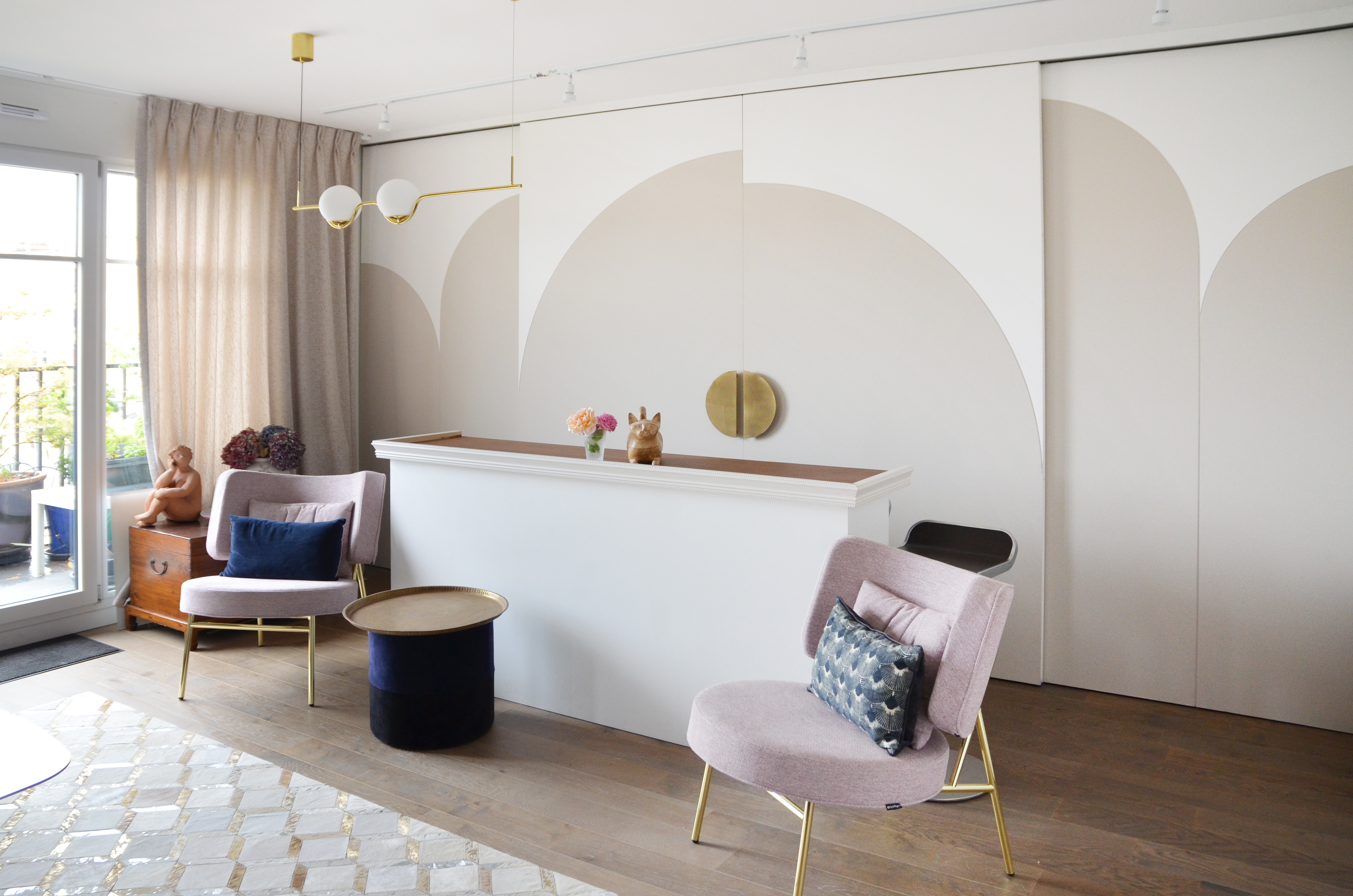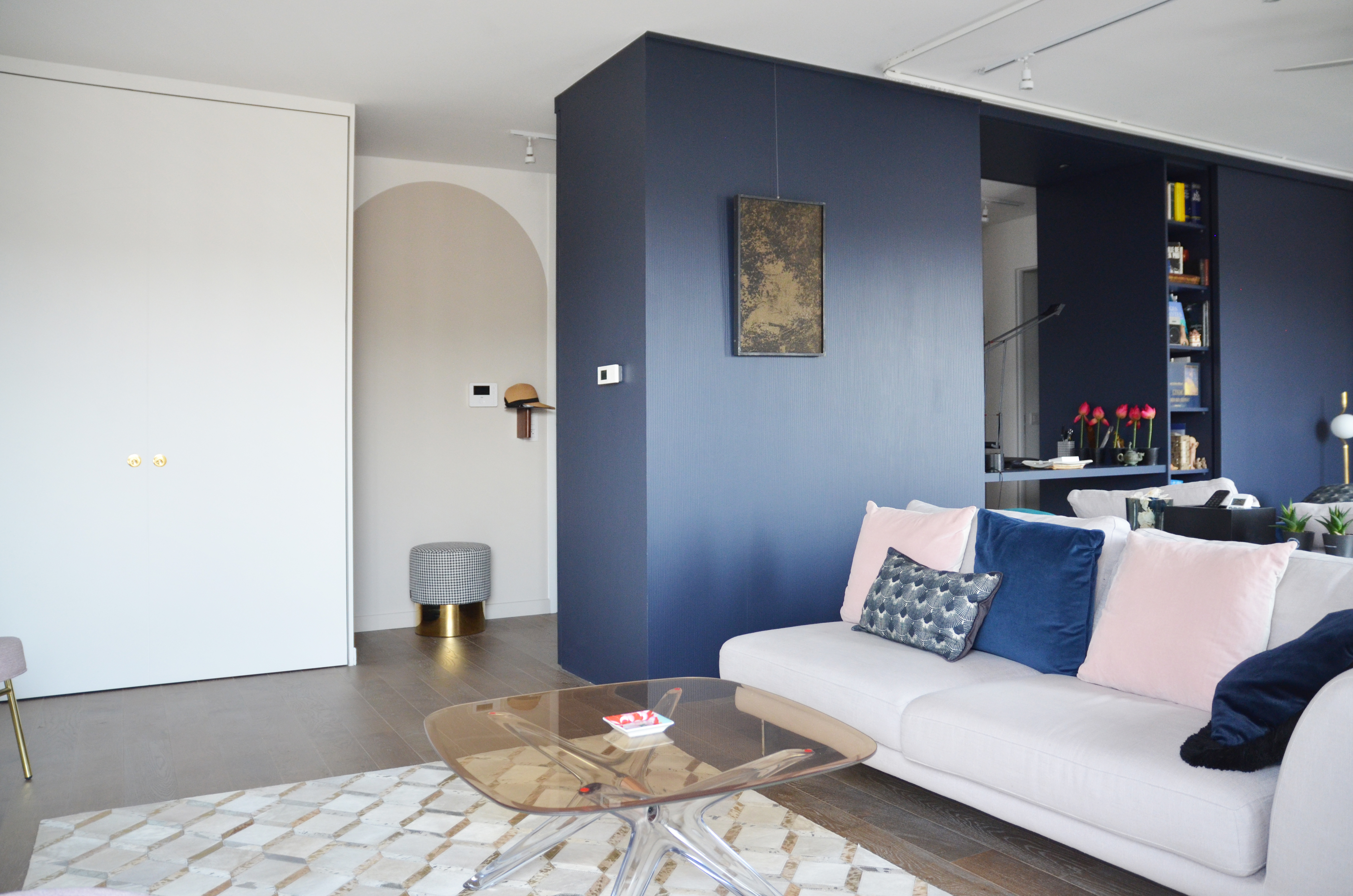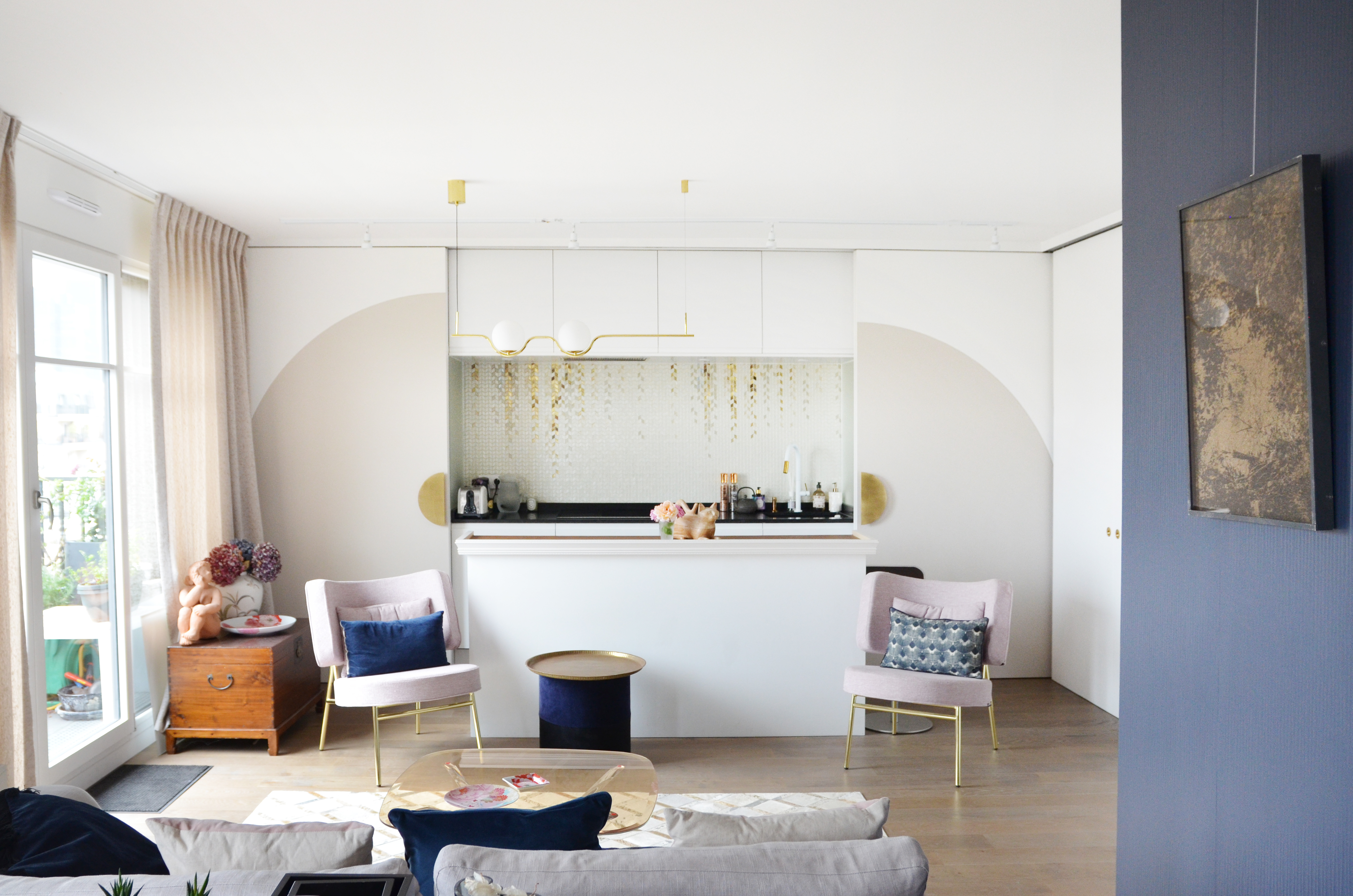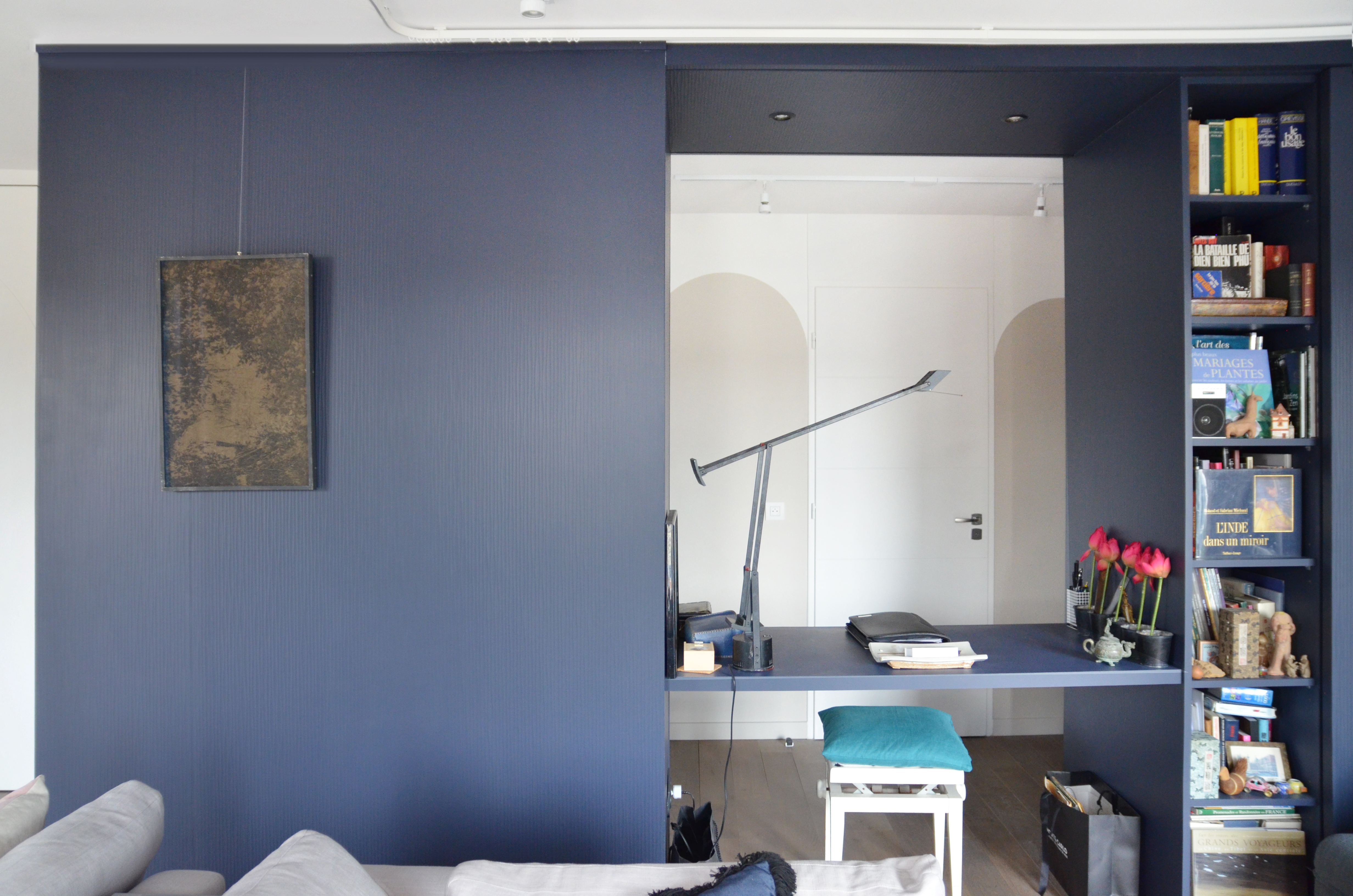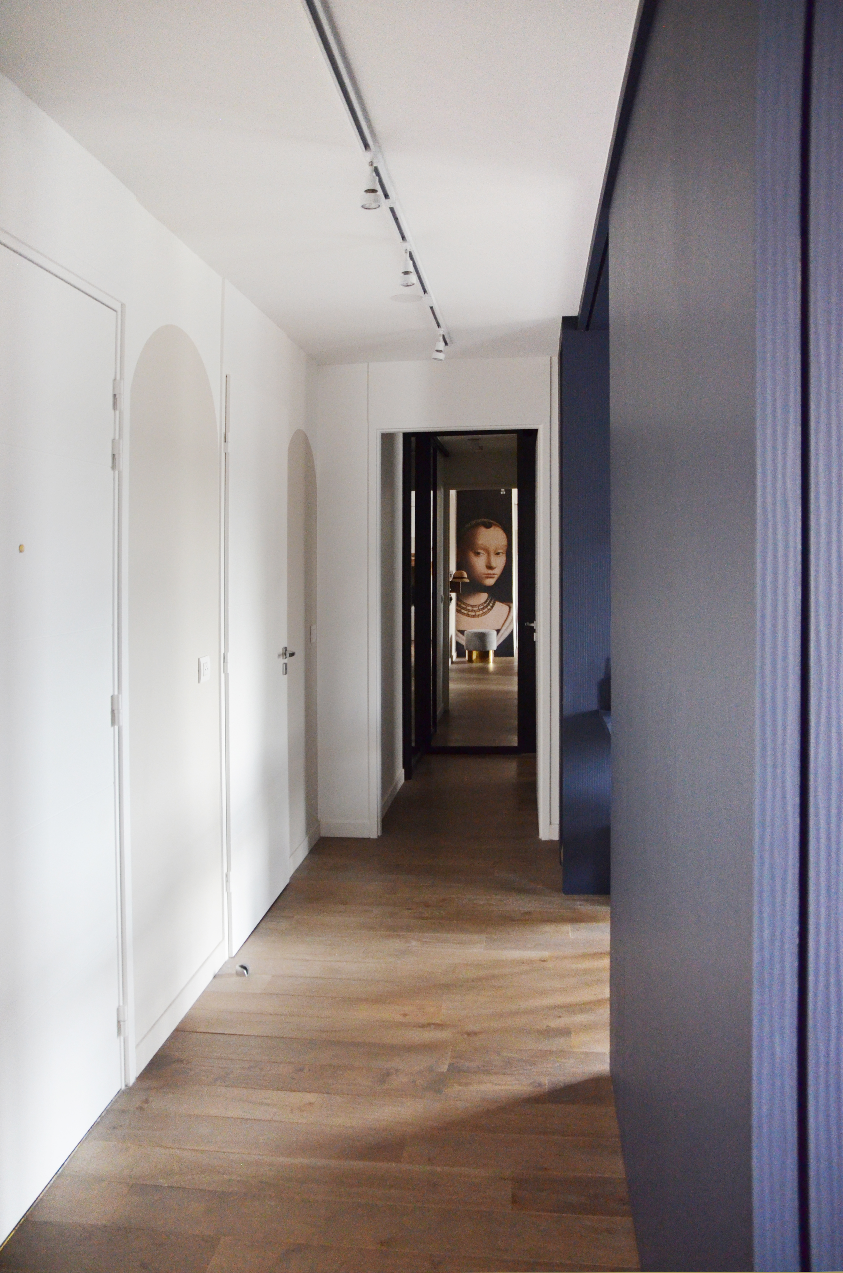 Voici un projet de création d’ambiance. En effet, si le monolithe bleu ainsi que l’aménagement de la cuisine ont été pensés en amont par le bureau d’étude Fables de murs, il a fallu travailler sur la caractérisation du lieu. Le jeu des arches permets d’homogénéiser l’ensemble, qu’elles soient pleines ou demies, à hauteur égale ou en quinconce. Une couleur douce s’associant au bleu du monolithe permet une transition vers la base blanche. La cuisine est une vraie « mise en scène ». Cachée grâce aux panneaux coulissants XXL, elle n’en reste pas moins élégante en révélant cette magnifique mosaïque, presque tableau, représentant les branches d’un saule pleureur. Le comptoir n’est pas exempt de détails telle que cette moulure faisant écho au collier que porte la « Jeune fille », portrait accueillant ses hôtes à l’entrée de l’appartement.