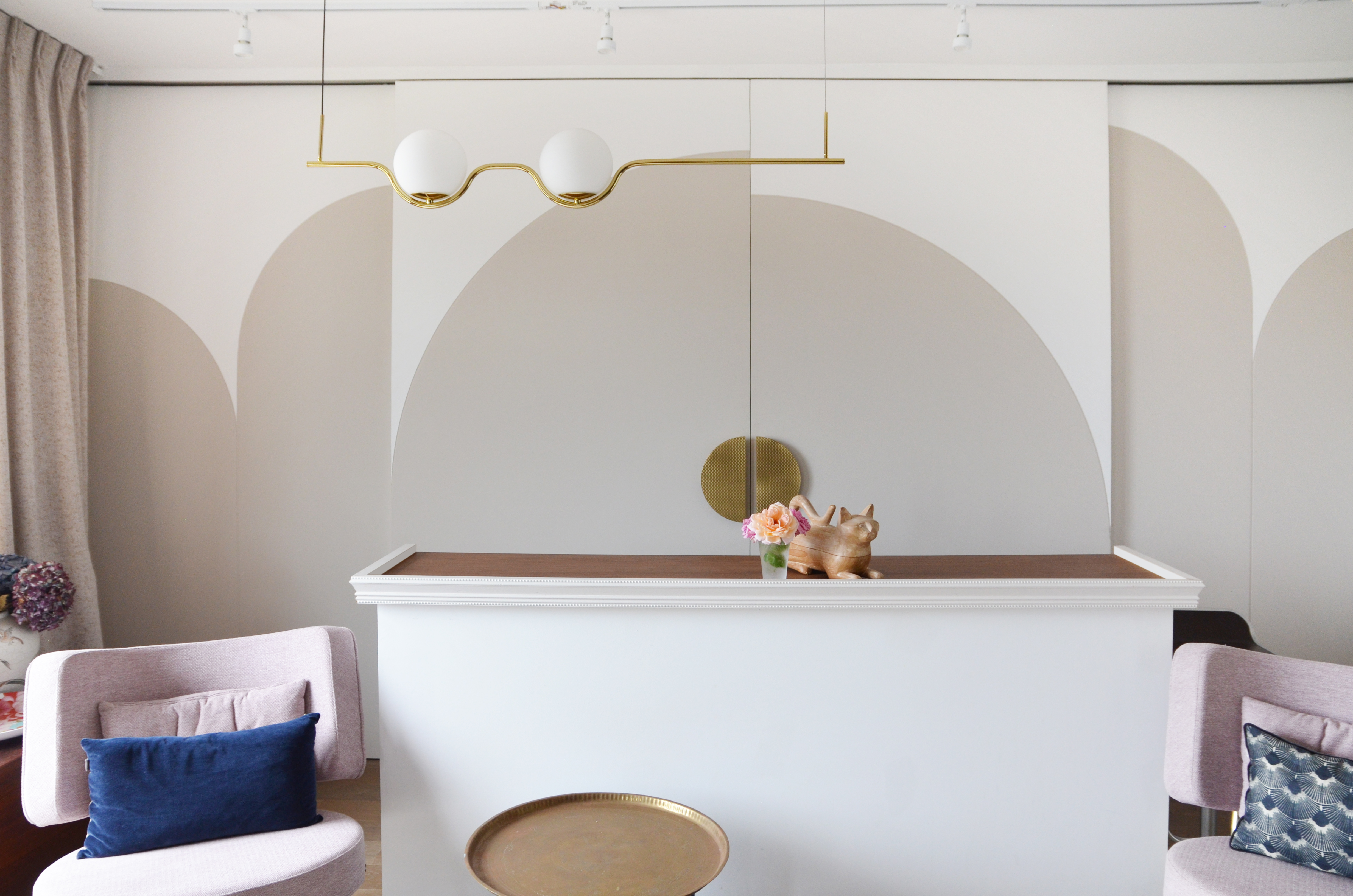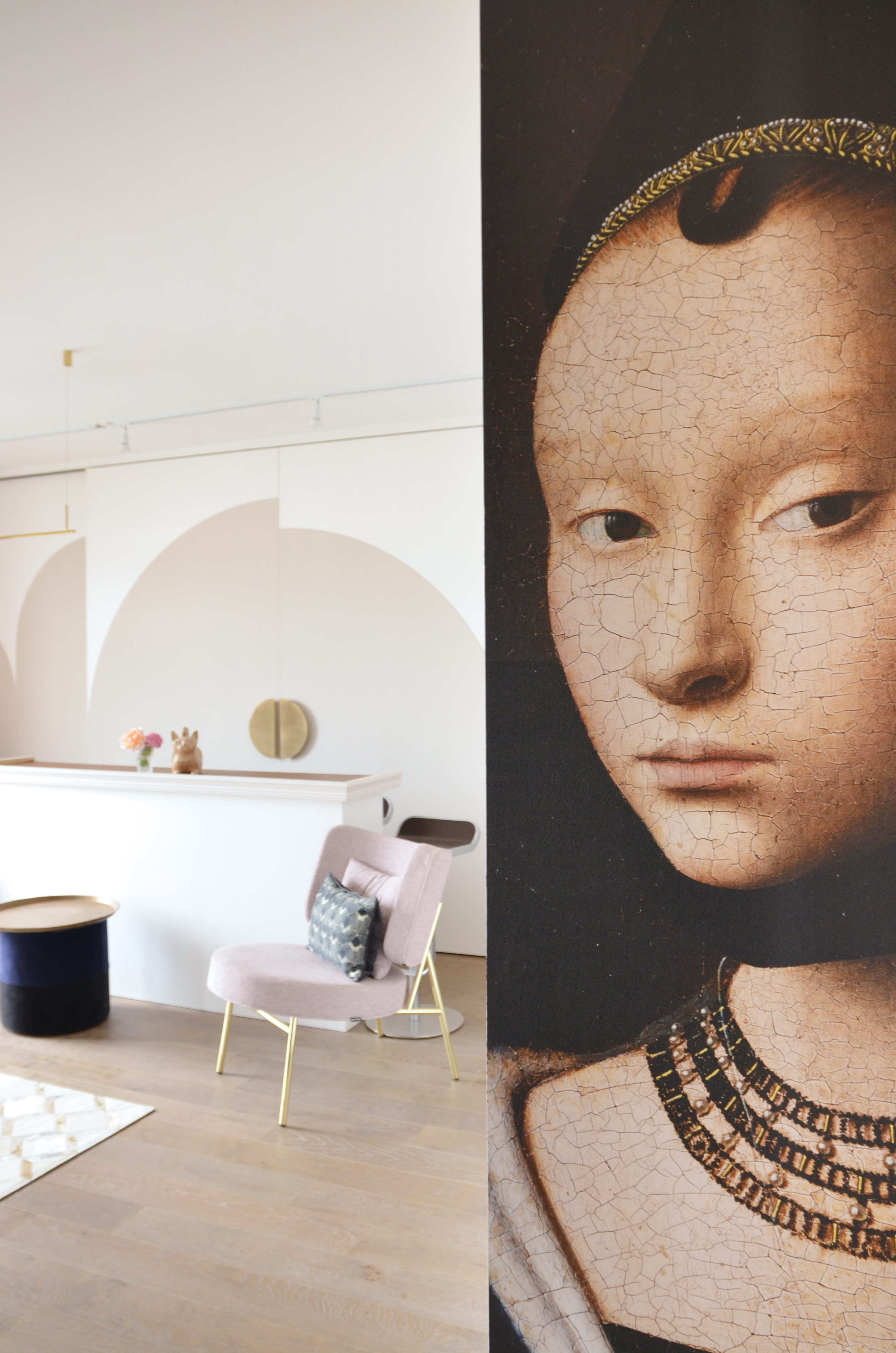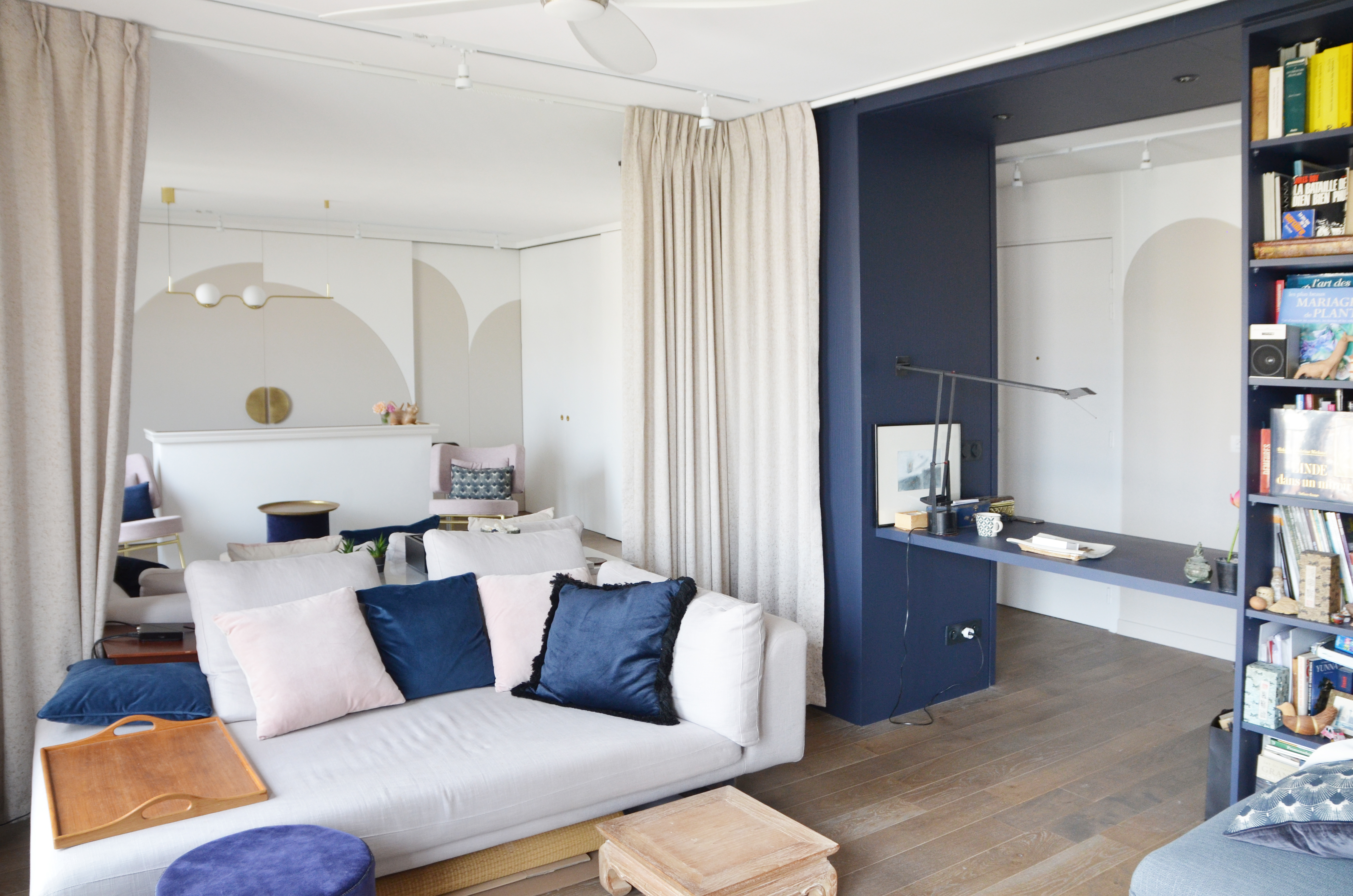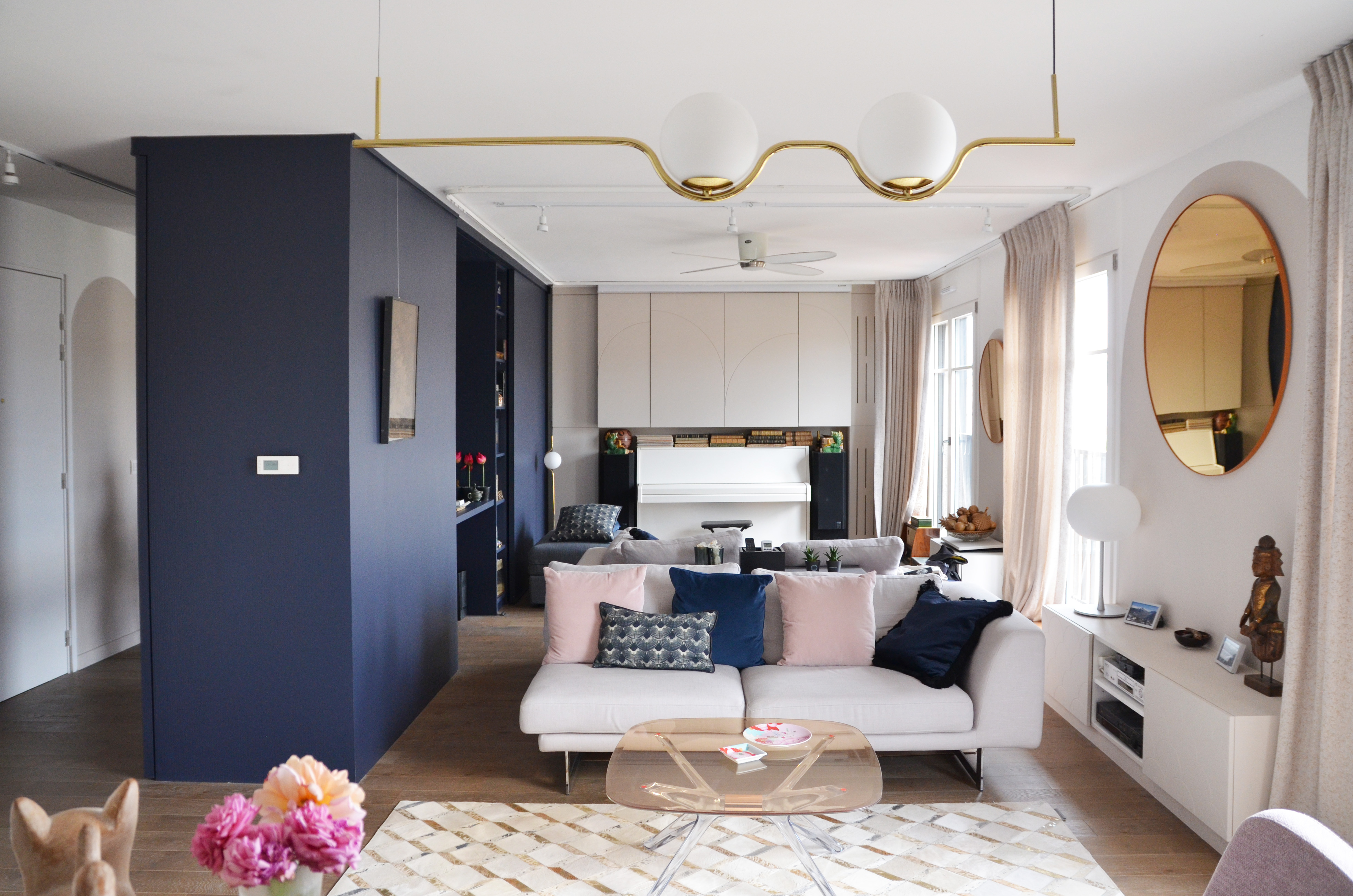 Voici un projet de création d’ambiance. En effet, si le monolithe bleu ainsi que l’aménagement de la cuisine ont été pensés en amont par le bureau d’étude Fables de murs, il a fallu travailler sur la caractérisation du lieu. Le jeu des arches permets d’homogénéiser l’ensemble, qu’elles soient pleines ou demies, à hauteur égale ou en quinconce. Une couleur douce s’associant au bleu du monolithe permet une transition vers la base blanche. La cuisine est une vraie « mise en scène ». Cachée grâce aux panneaux coulissants XXL, elle n’en reste pas moins élégante en révélant cette magnifique mosaïque, presque tableau, représentant les branches d’un saule pleureur. Le comptoir n’est pas exempt de détails telle que cette moulure faisant écho au collier que porte la « Jeune fille », portrait accueillant ses hôtes à l’entrée de l’appartement.