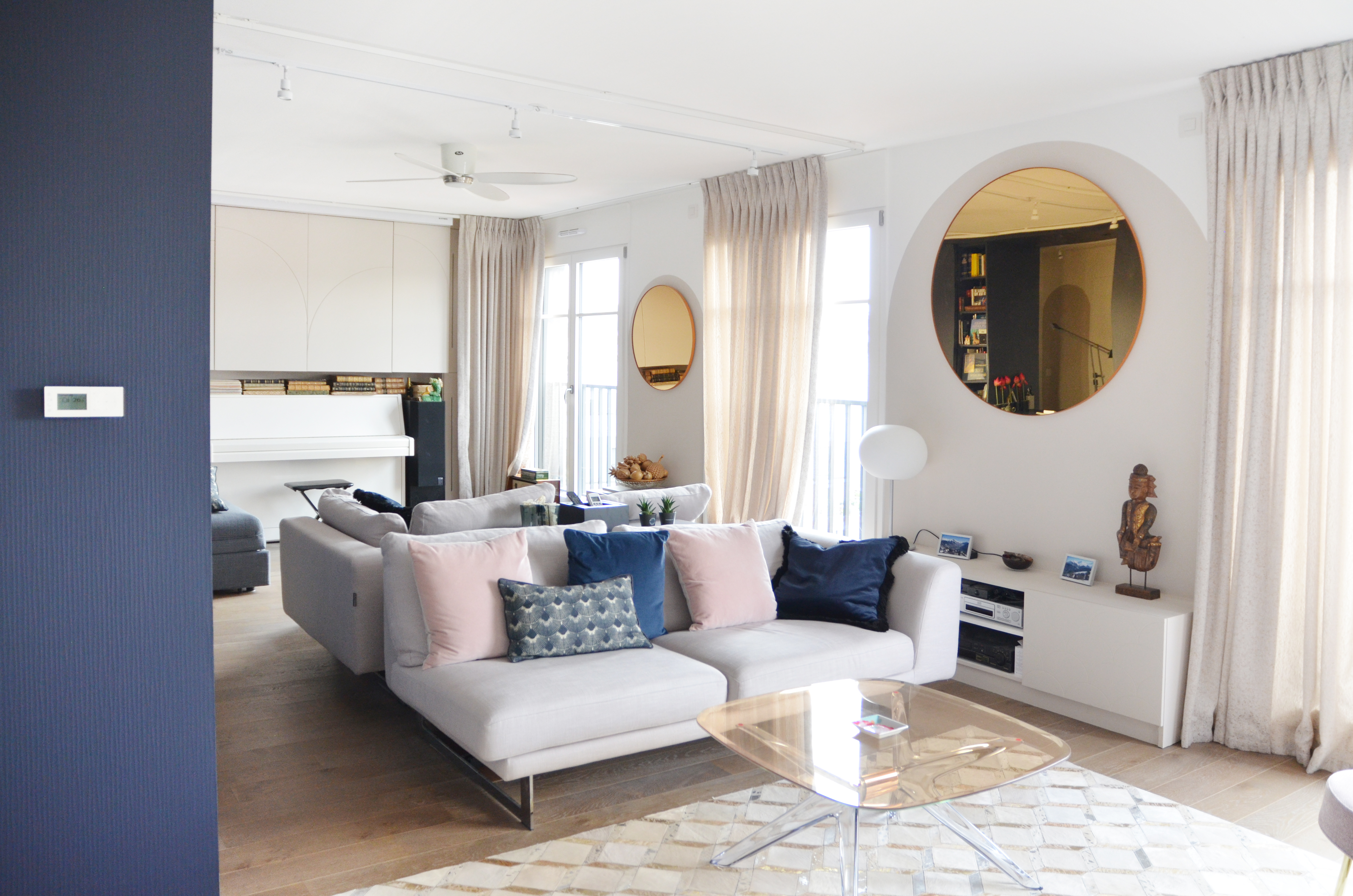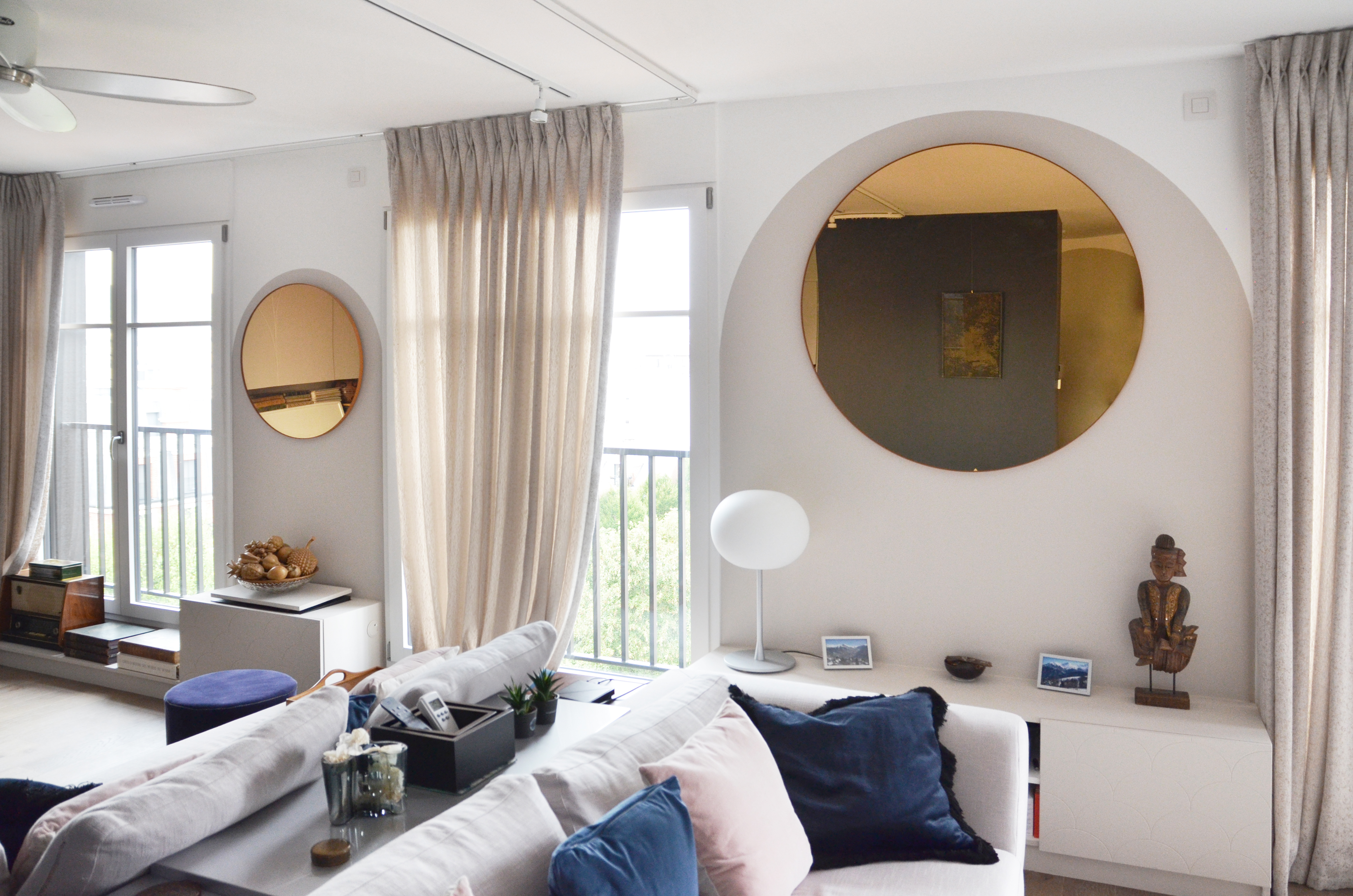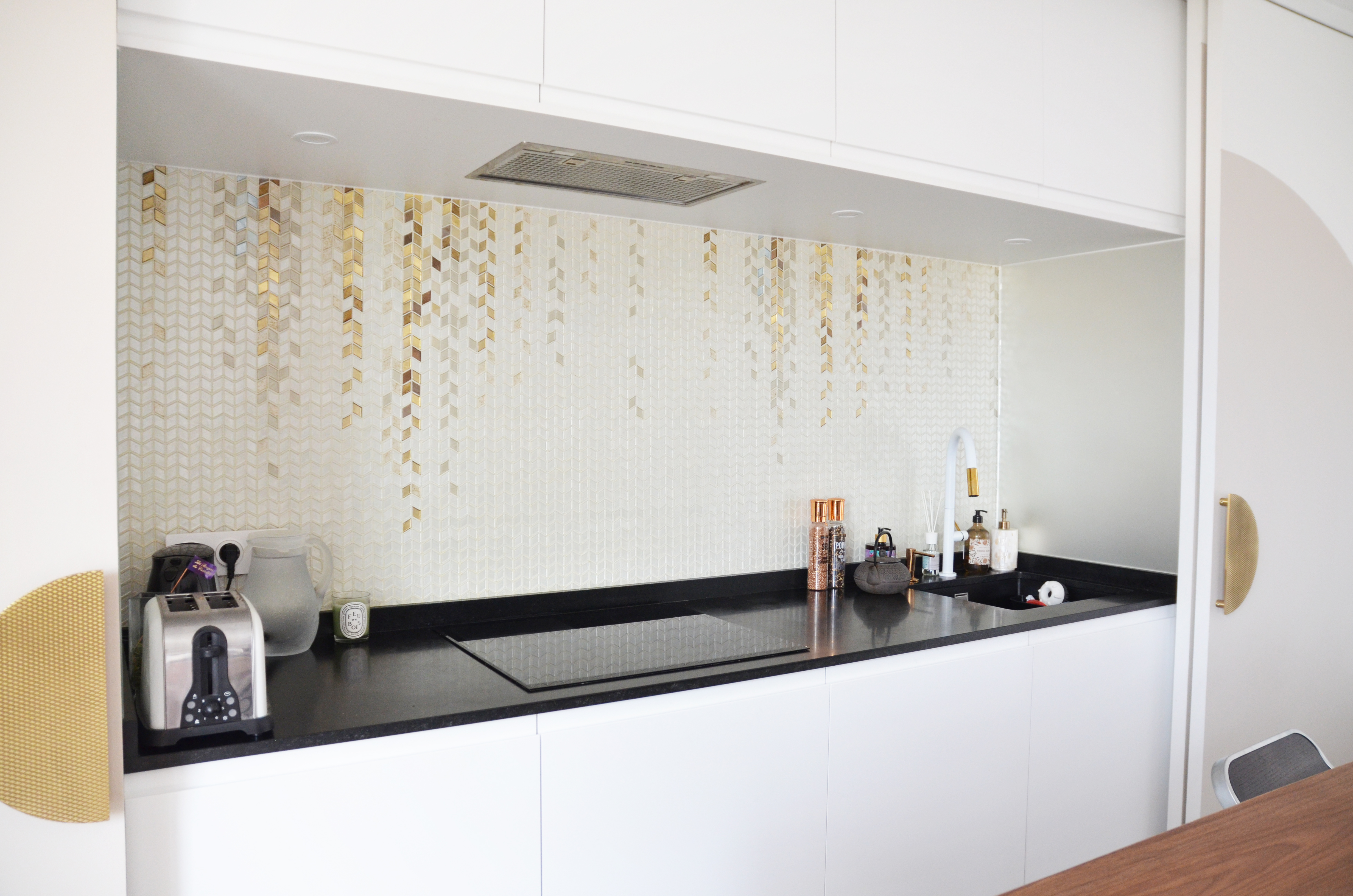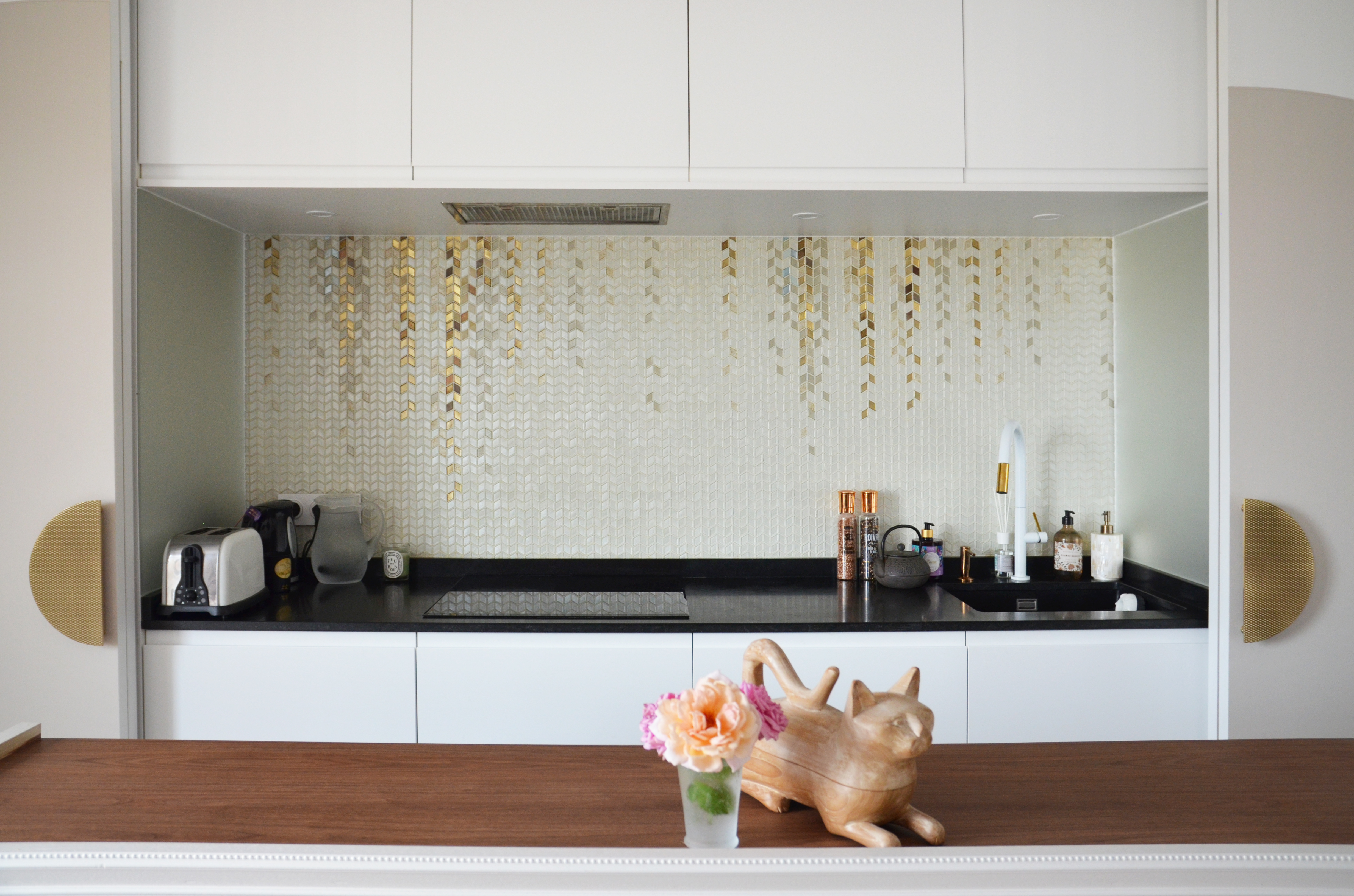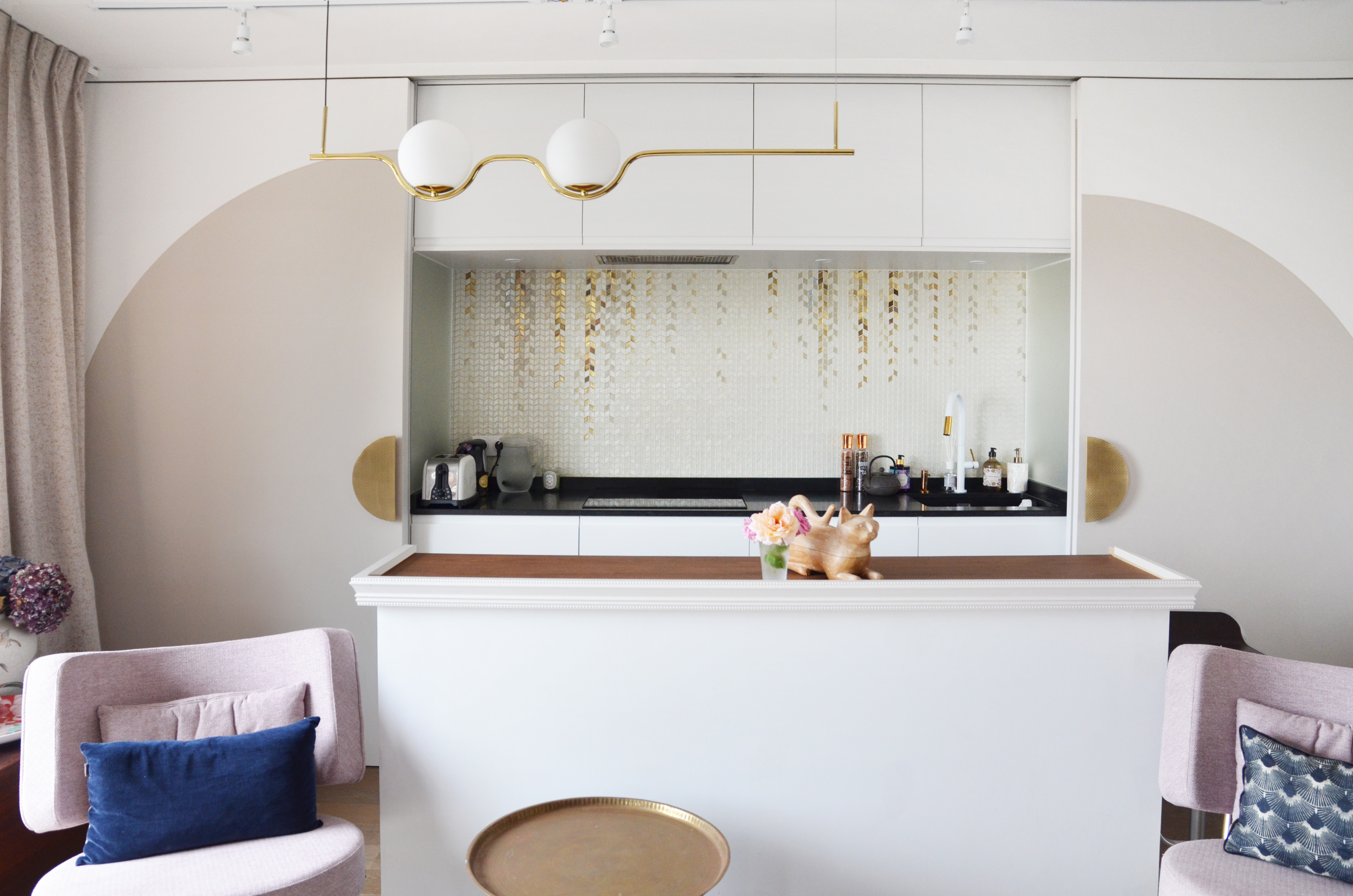 Voici un projet de création d’ambiance. En effet, si le monolithe bleu ainsi que l’aménagement de la cuisine ont été pensés en amont par le bureau d’étude Fables de murs, il a fallu travailler sur la caractérisation du lieu. Le jeu des arches permets d’homogénéiser l’ensemble, qu’elles soient pleines ou demies, à hauteur égale ou en quinconce. Une couleur douce s’associant au bleu du monolithe permet une transition vers la base blanche. La cuisine est une vraie « mise en scène ». Cachée grâce aux panneaux coulissants XXL, elle n’en reste pas moins élégante en révélant cette magnifique mosaïque, presque tableau, représentant les branches d’un saule pleureur. Le comptoir n’est pas exempt de détails telle que cette moulure faisant écho au collier que porte la « Jeune fille », portrait accueillant ses hôtes à l’entrée de l’appartement.