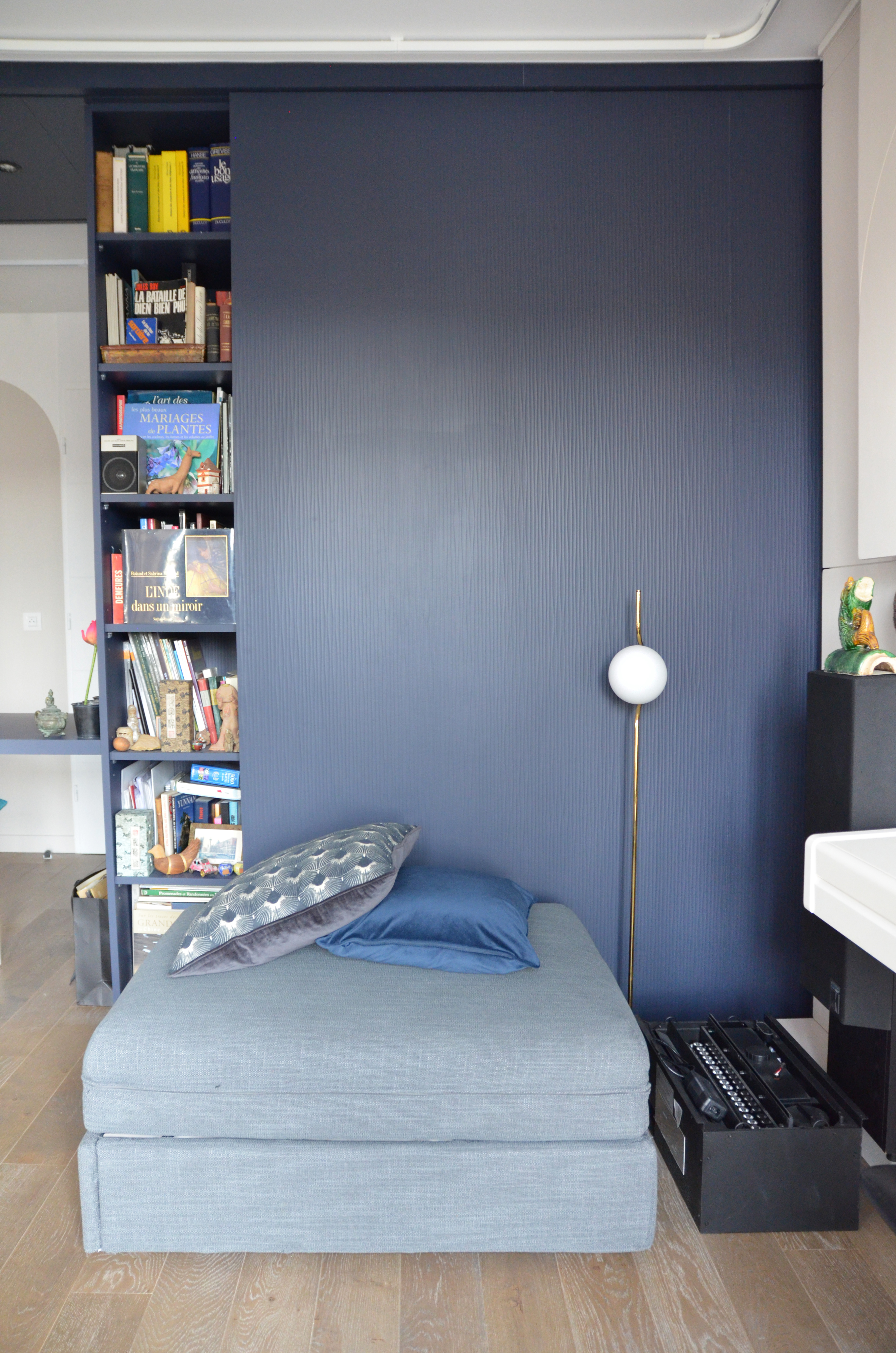 Côté salon, le piano est encadré de rangements ainsi que d’un cache radiateur. Cette partie peut être totalement fermée avec les rideaux sur leurs rails qui parcourent le plafond, créant une alcôve, une pièce supplémentaire pour recevoir les amis et parents.