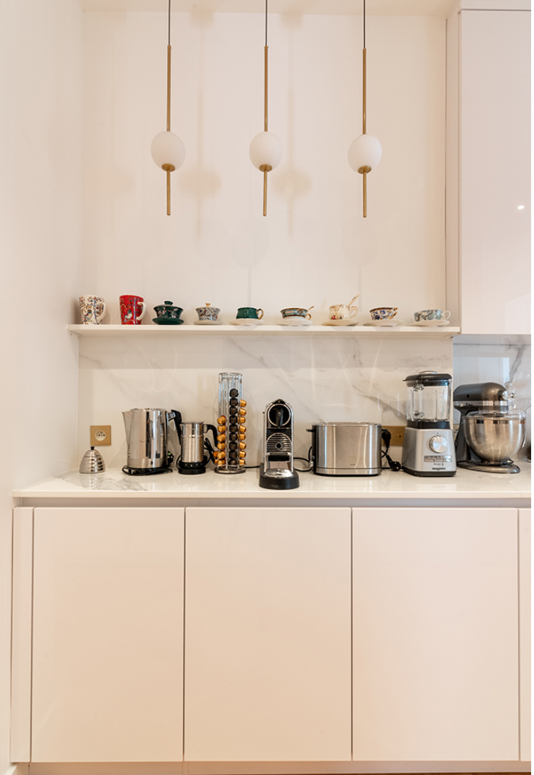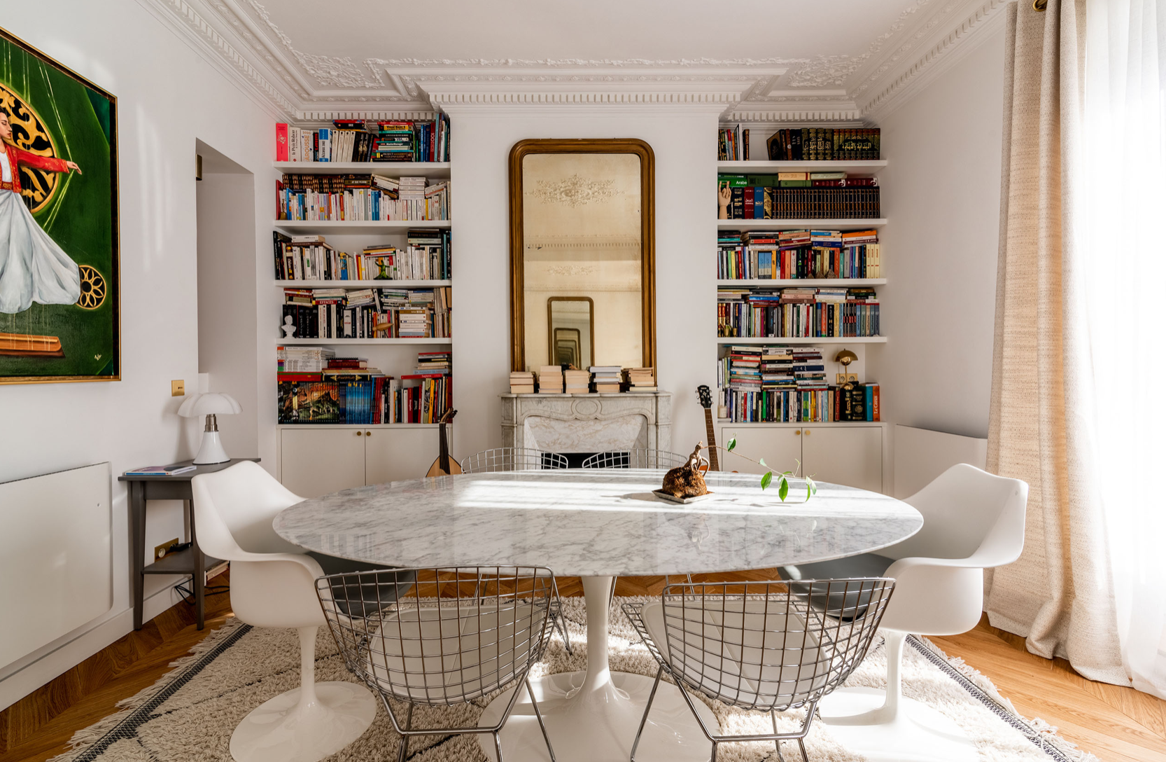 Le double séjour, baigné de lumière naturelle, a été conçu pour accueillir un vaste linéaire de bibliothèques sur mesure et mettre en valeur le mobilier des propriétaires. La cuisine, conservée à son emplacement d’origine, a été décloisonnée et ouverte sur la salle à manger grâce à un passe-plat sur-mesure, favorisant la convivialité tout en préservant la fluidité des circulations.