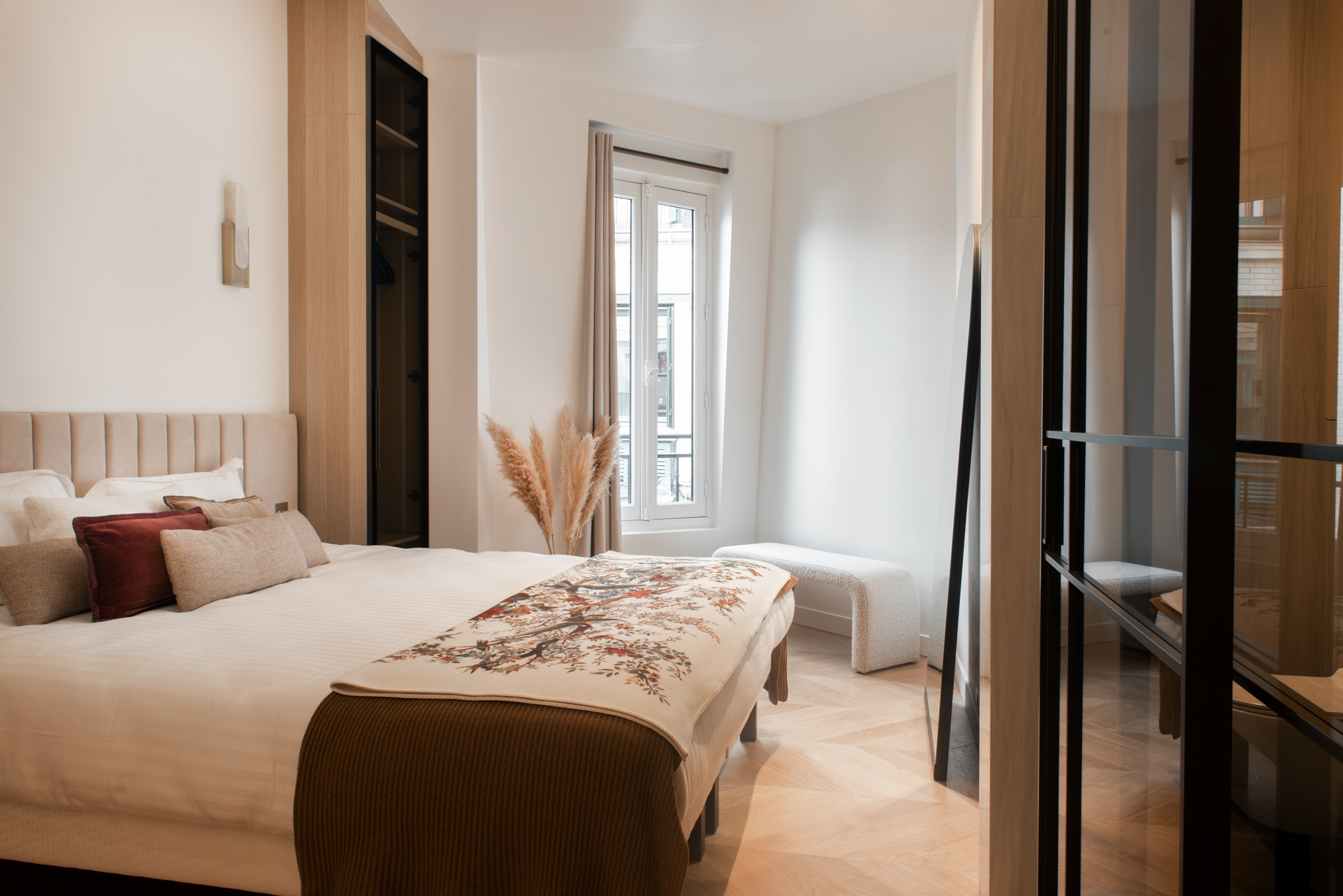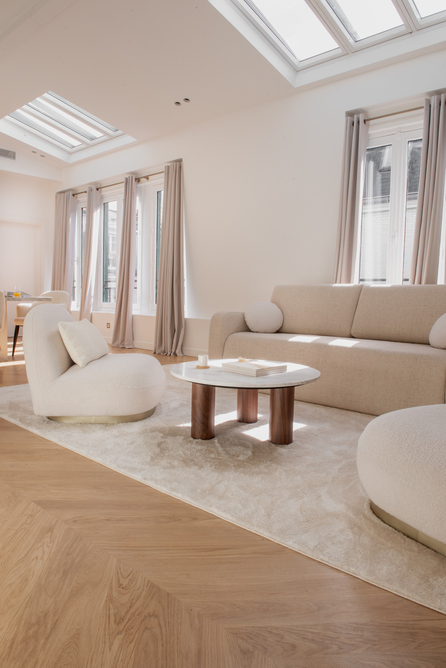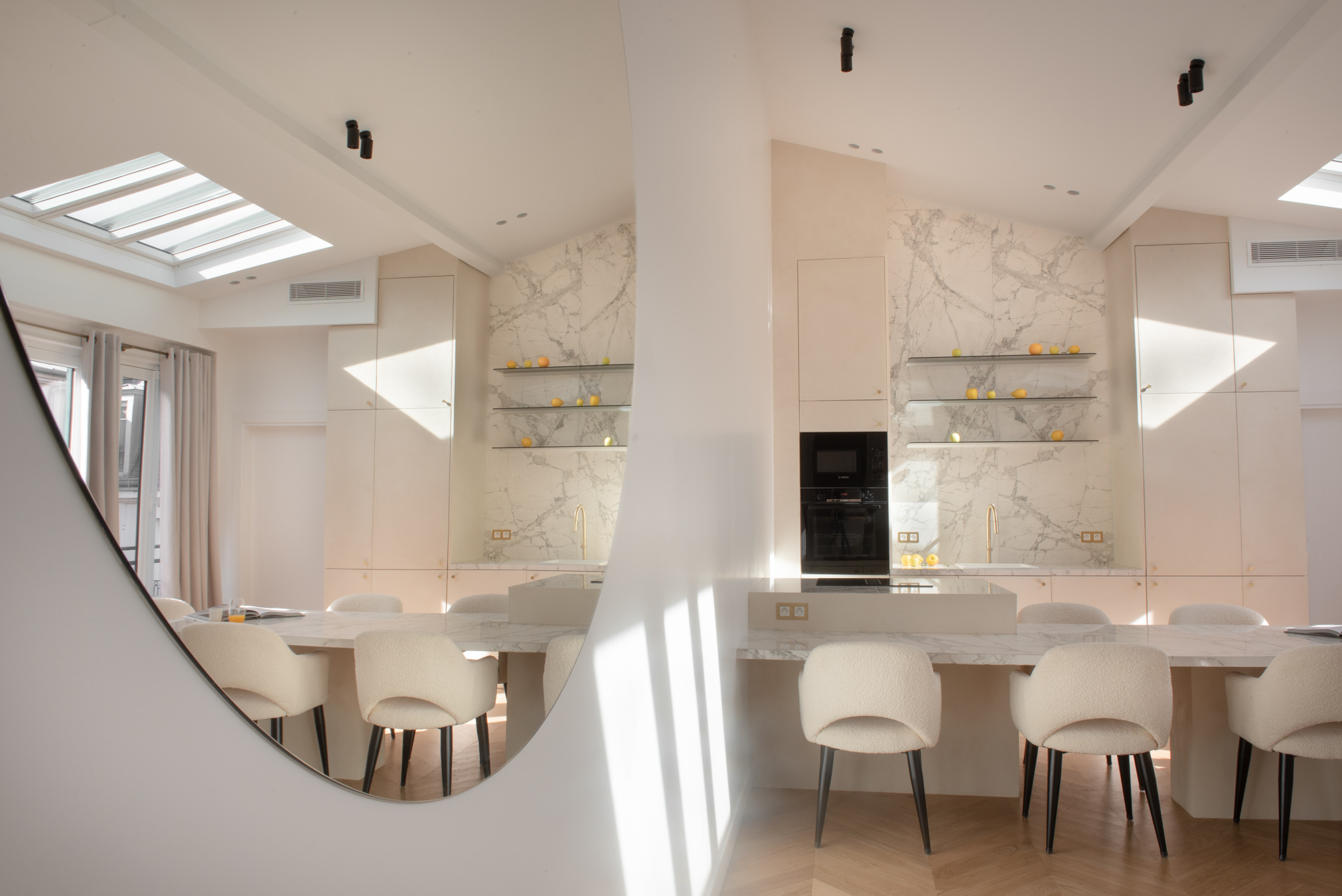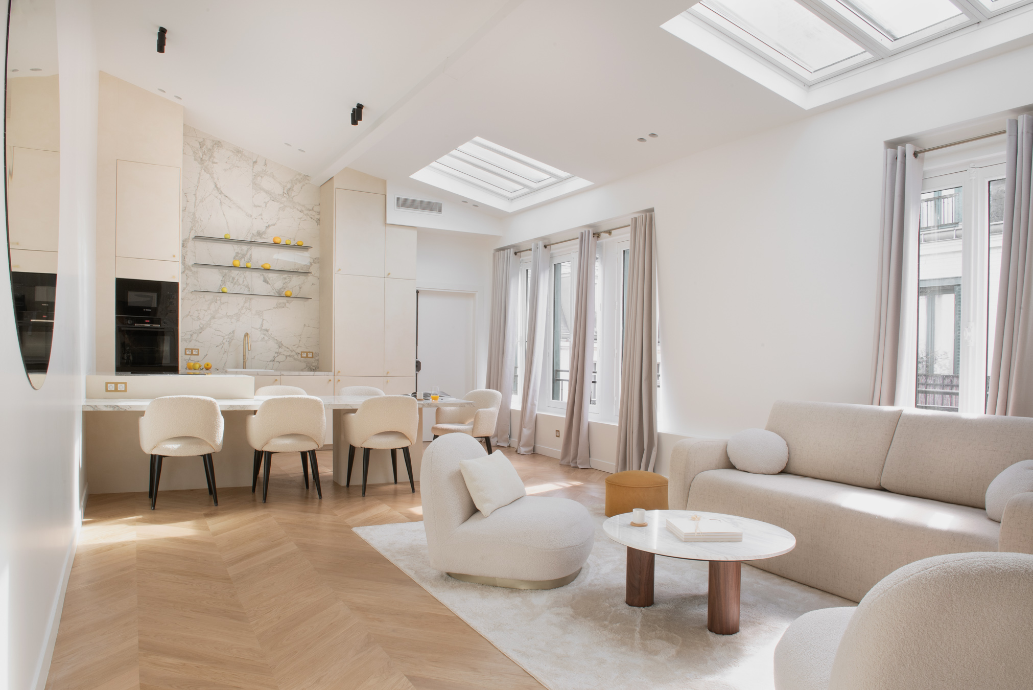 Rennovation complète d'un ancien cabinet médical pour en faire un appartement locatif premium. Tout a été démoli et réagencé pour créer un vaste espace de vie avec cuisine ouverte, deux chambres avec leurs salles de bain privatives et des WC séparés. Design contemporain, chaleur et confort : l'appartement offre le standing d'un hôtel tout en permettant de se sentir comme chez soi.