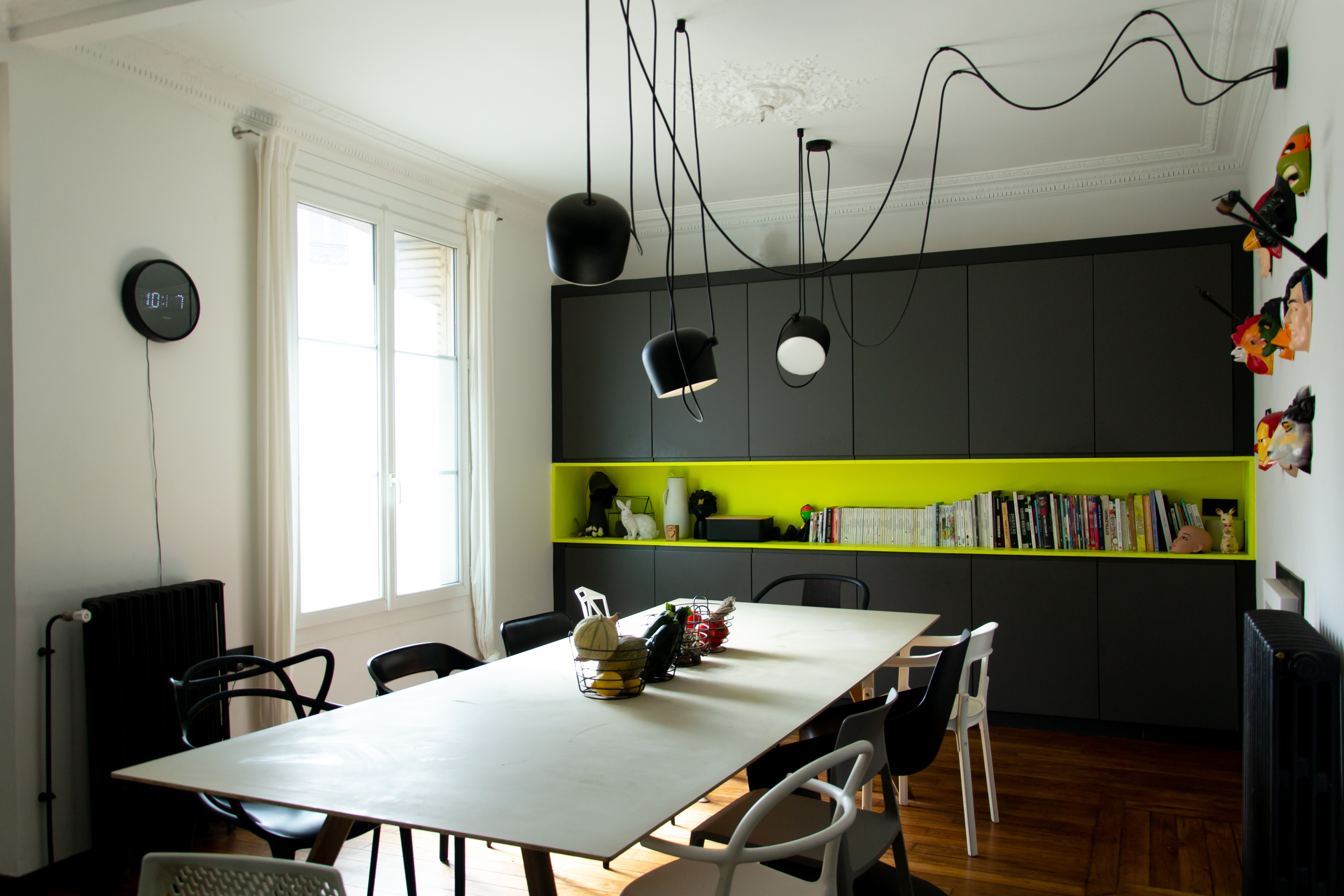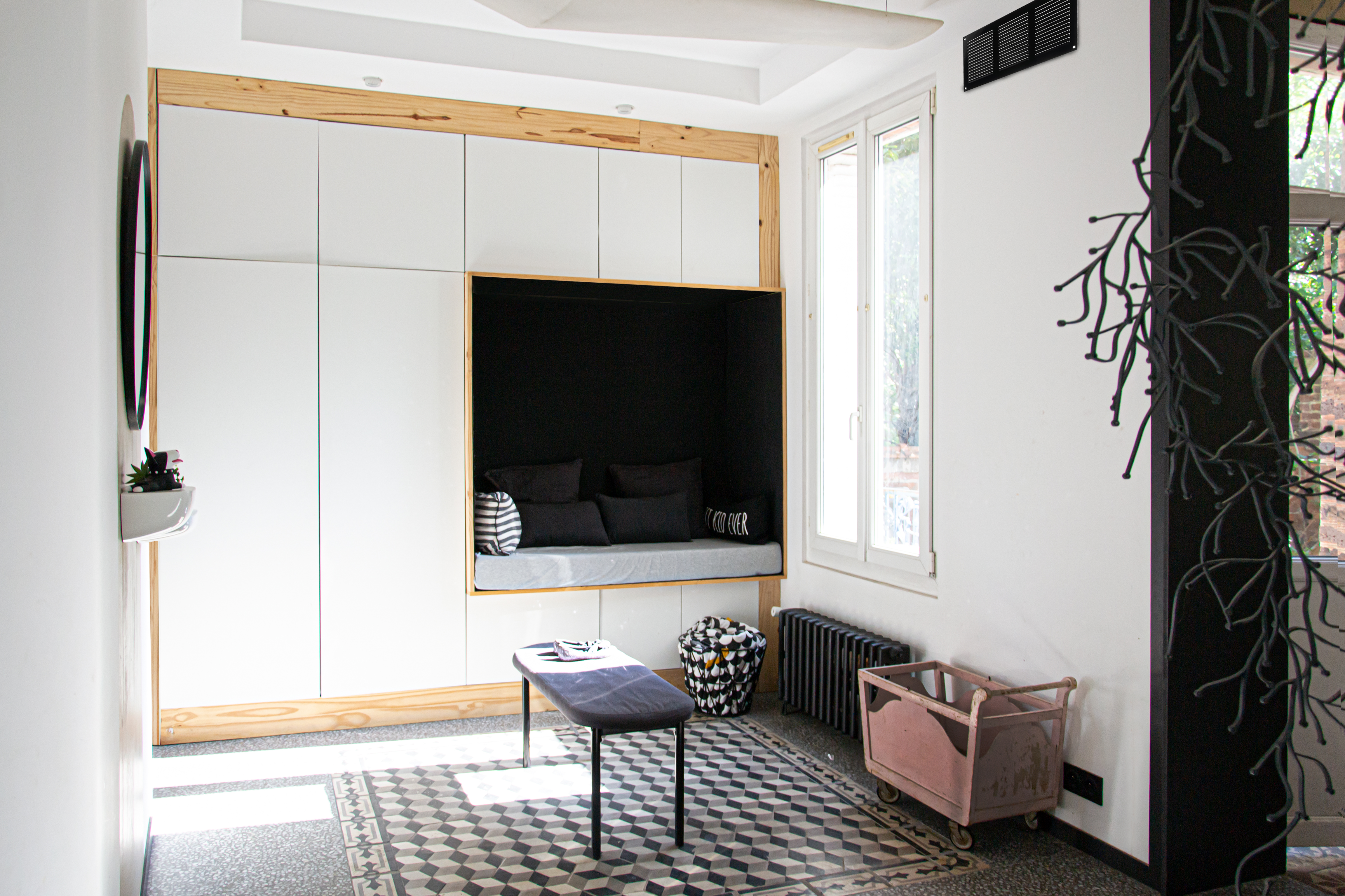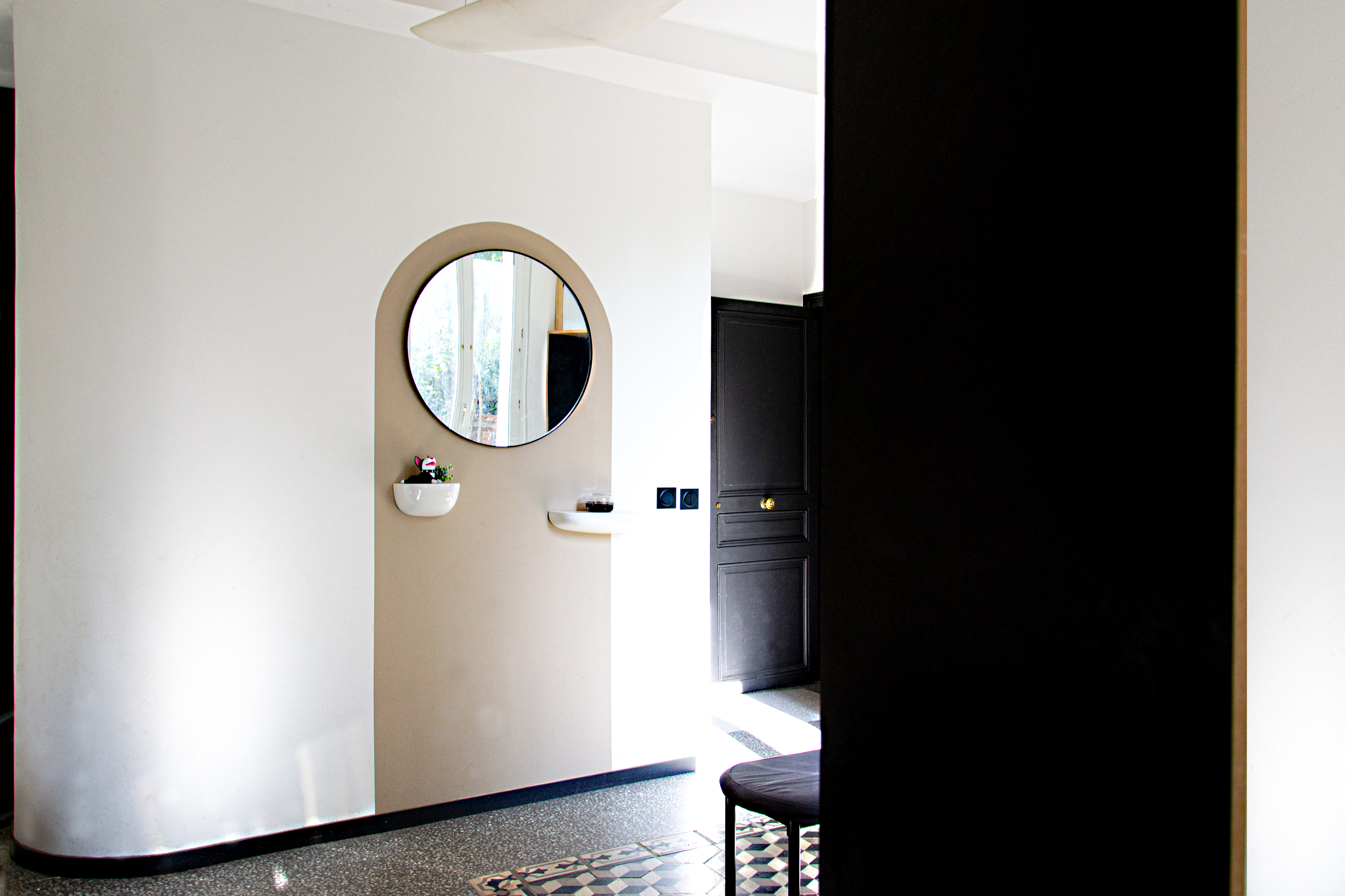 Le bien est trouvé, mais divisé en deux appartements distincts sans communication. Le rez de chaussée est dans son jus, voir en mauvais état dans certaines pièces, et réparti en plein de petites pièces. Le travail a été de retrouver la grandeur de la bâtisse, et valoriser son existant avec ses corniches, son parquet, ses radiateurs en fonte. Pour au final, conserver l'existant et le transporter dans le nouveau siècle.