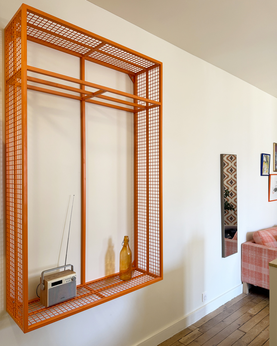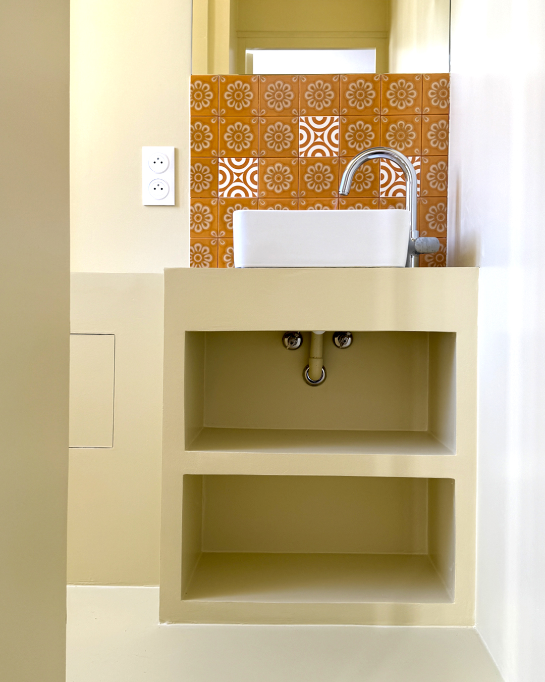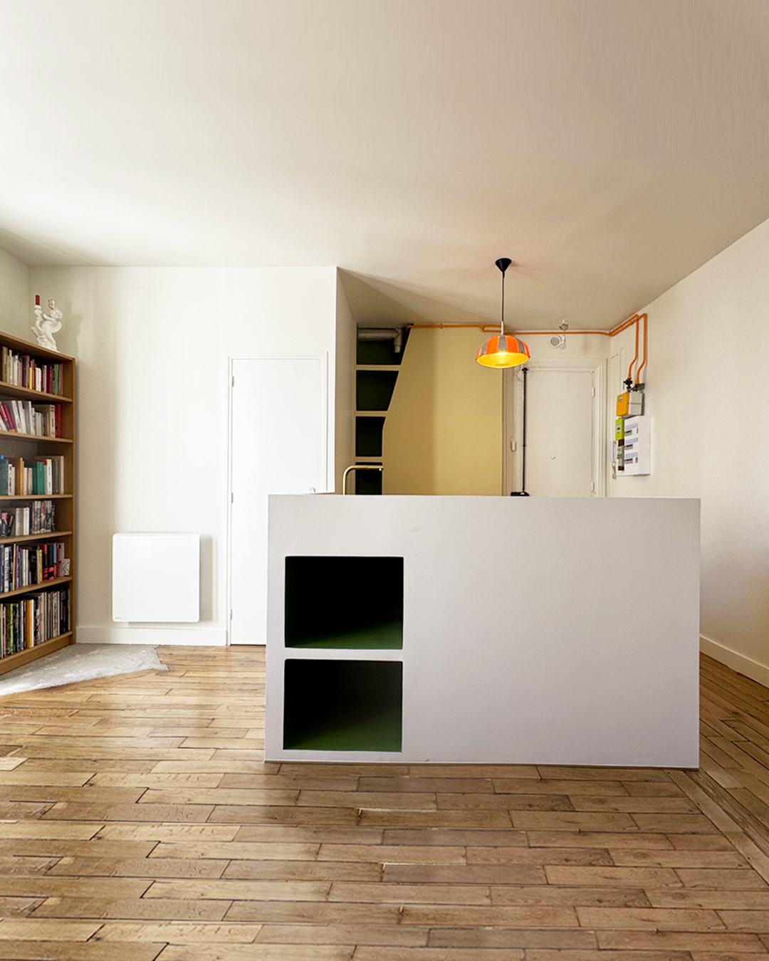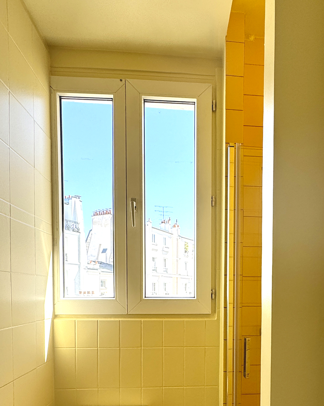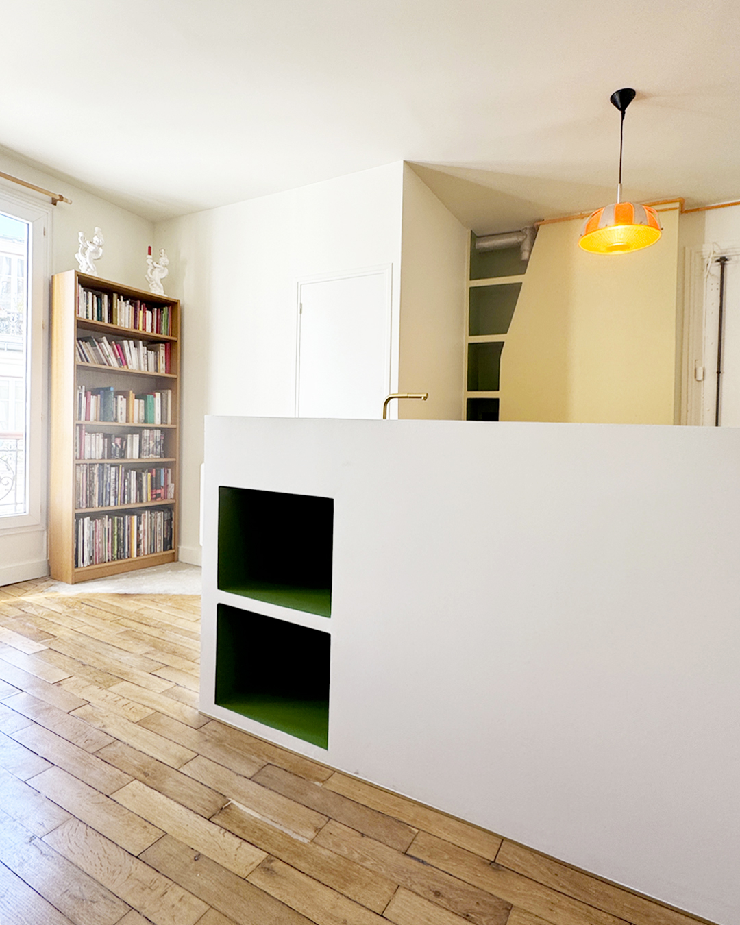 La rénovation de cet appartement situé dans le 18e arrondissement de Paris s’articule autour d’une première intention posée par le maître d’ouvrage : l’agrandissement de la salle d’eau. Ce geste, d’apparence purement fonctionnelle, agit en réalité comme un point de bascule dans la distribution intérieure. Il génère une nouvelle dynamique spatiale, où les usages s’entrelacent et les volumes s’imbriquent avec fluidité.