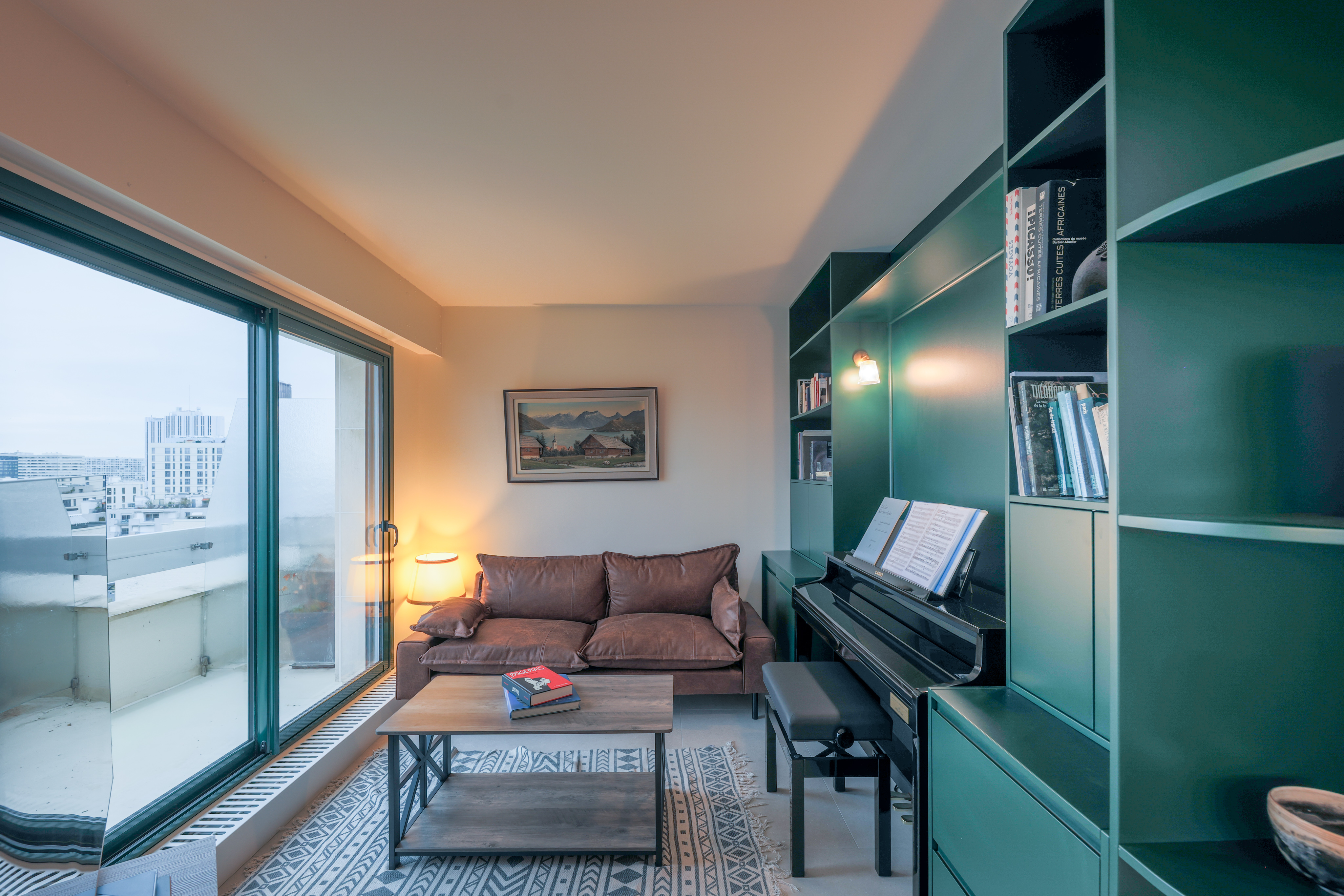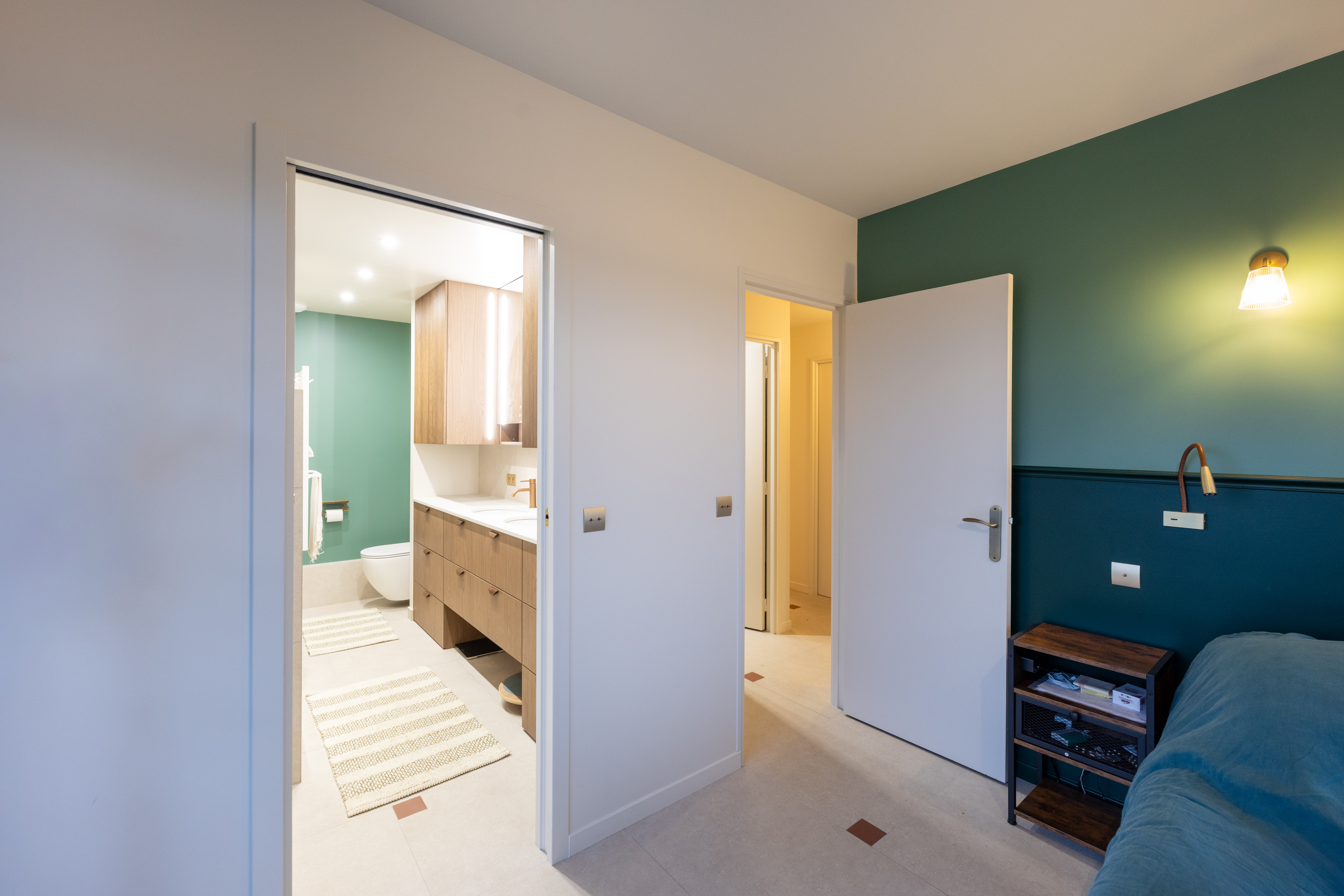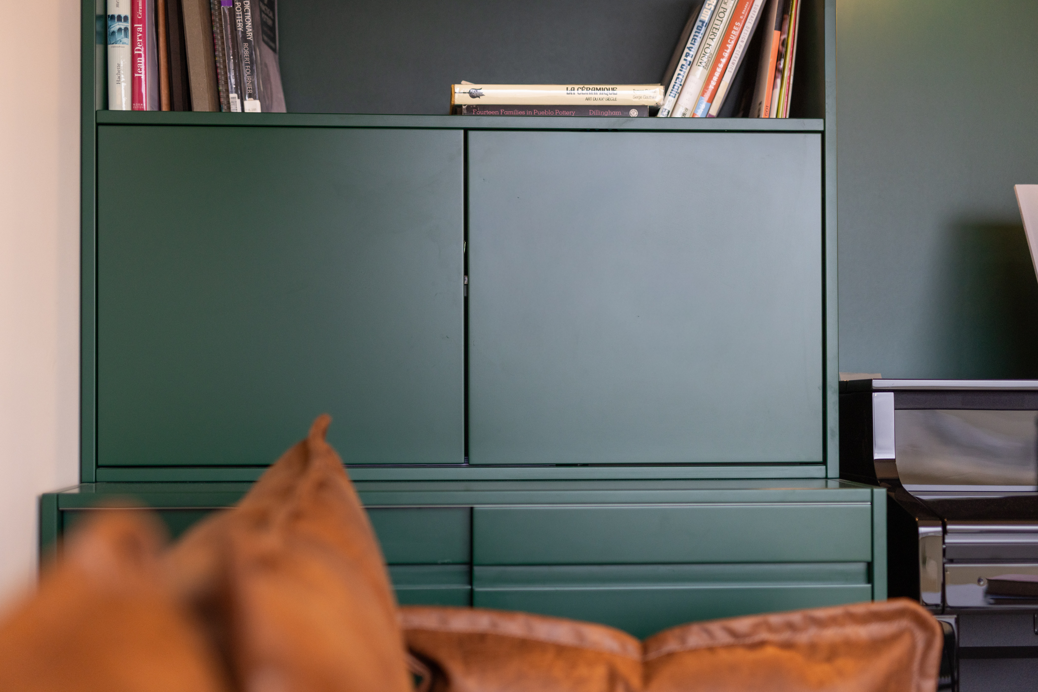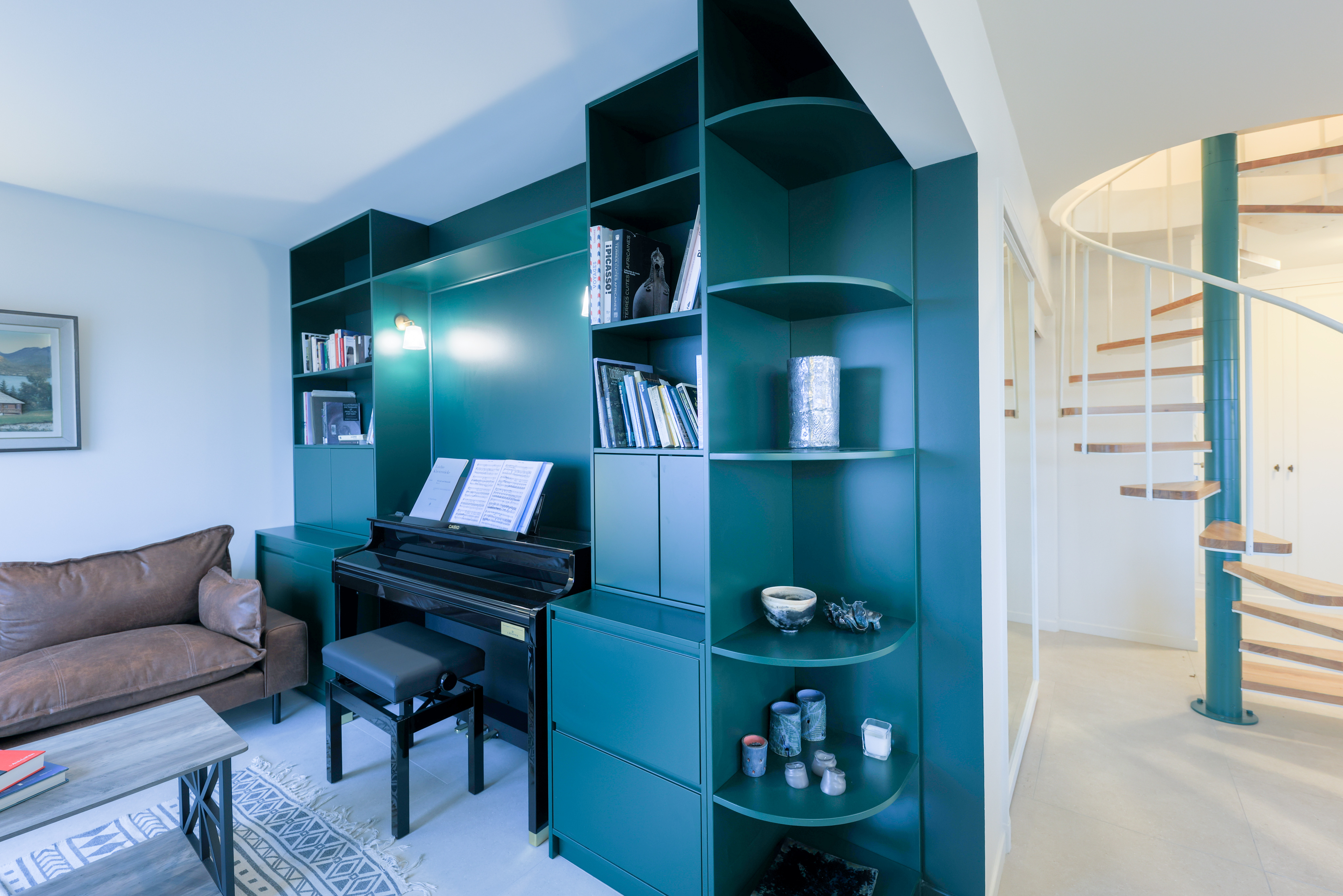 Le vert, couleur dominante des menuiseries sur mesure, fait écho à la végétation extérieure et apporte du rythme à l’espace. Il est subtilement contrasté par des touches de rouge, présentes dans les cabochons du sol et quelques aplats de peinture, qui apportent relief et caractère à l’ensemble.