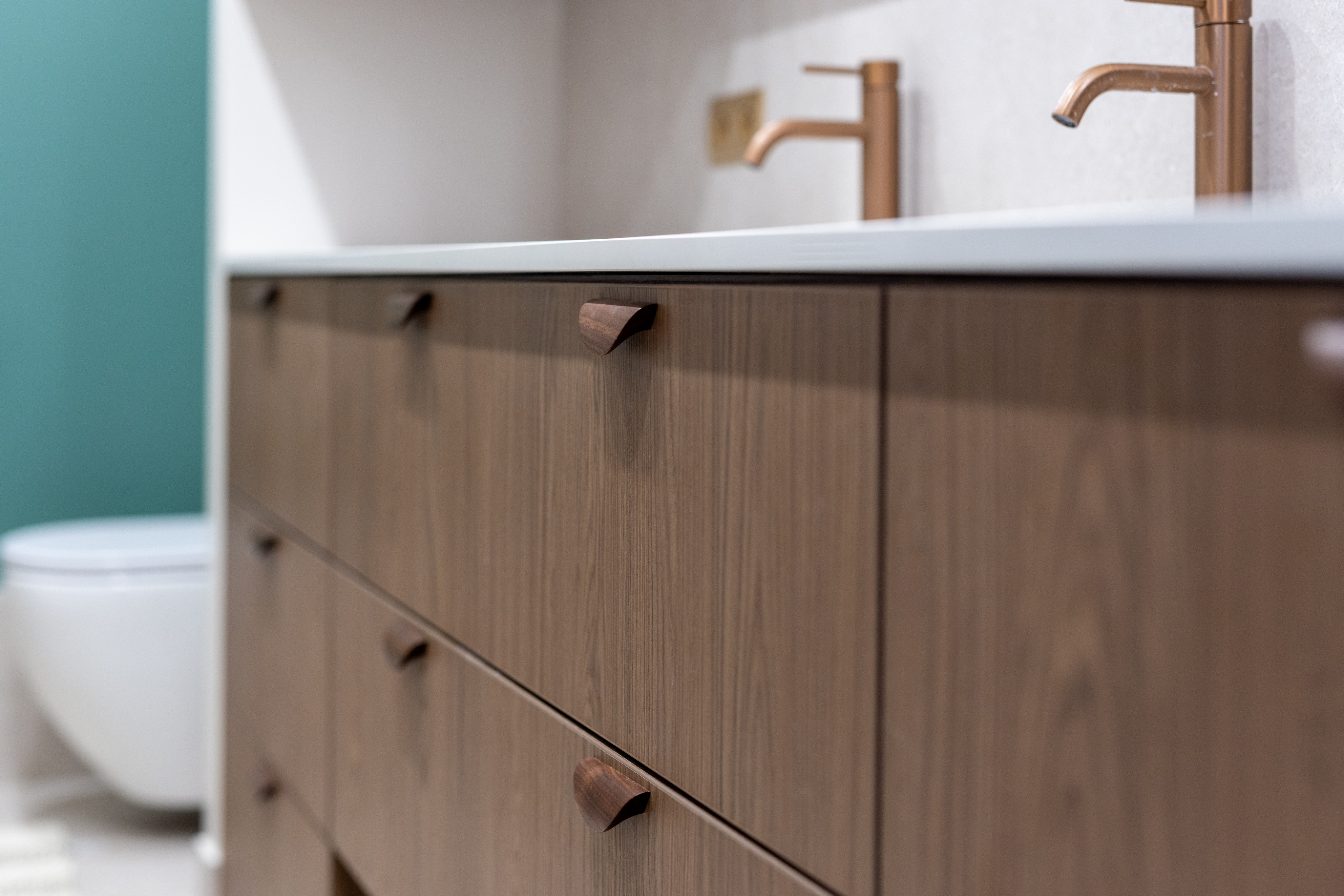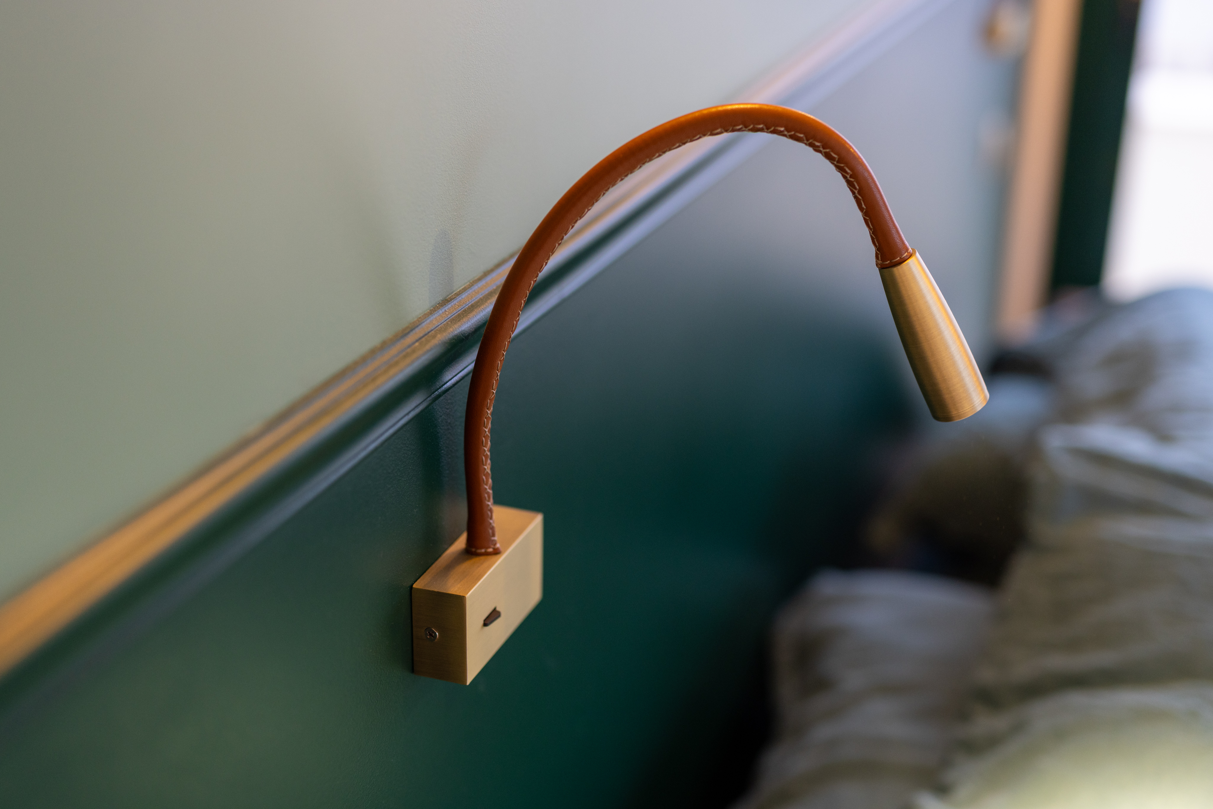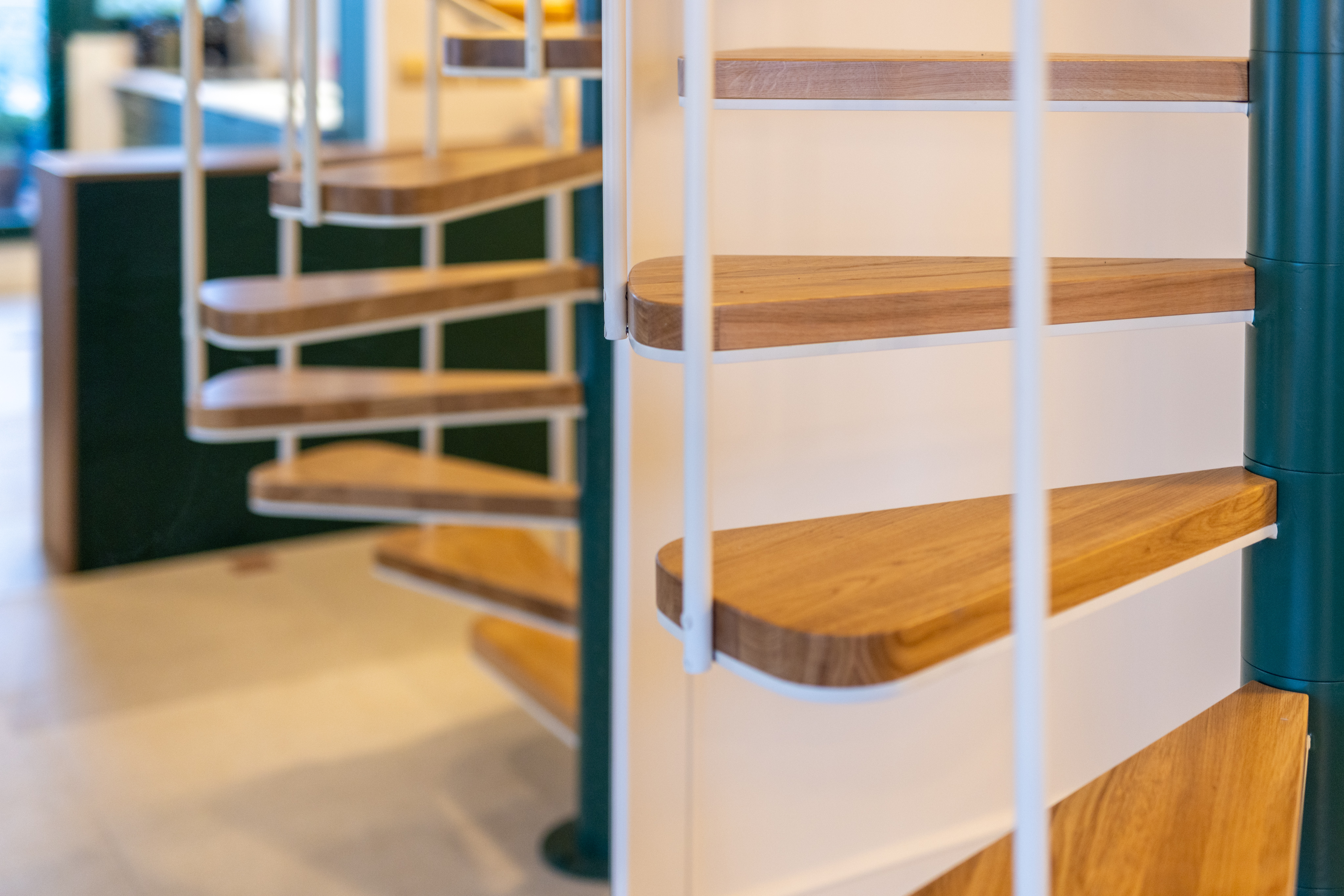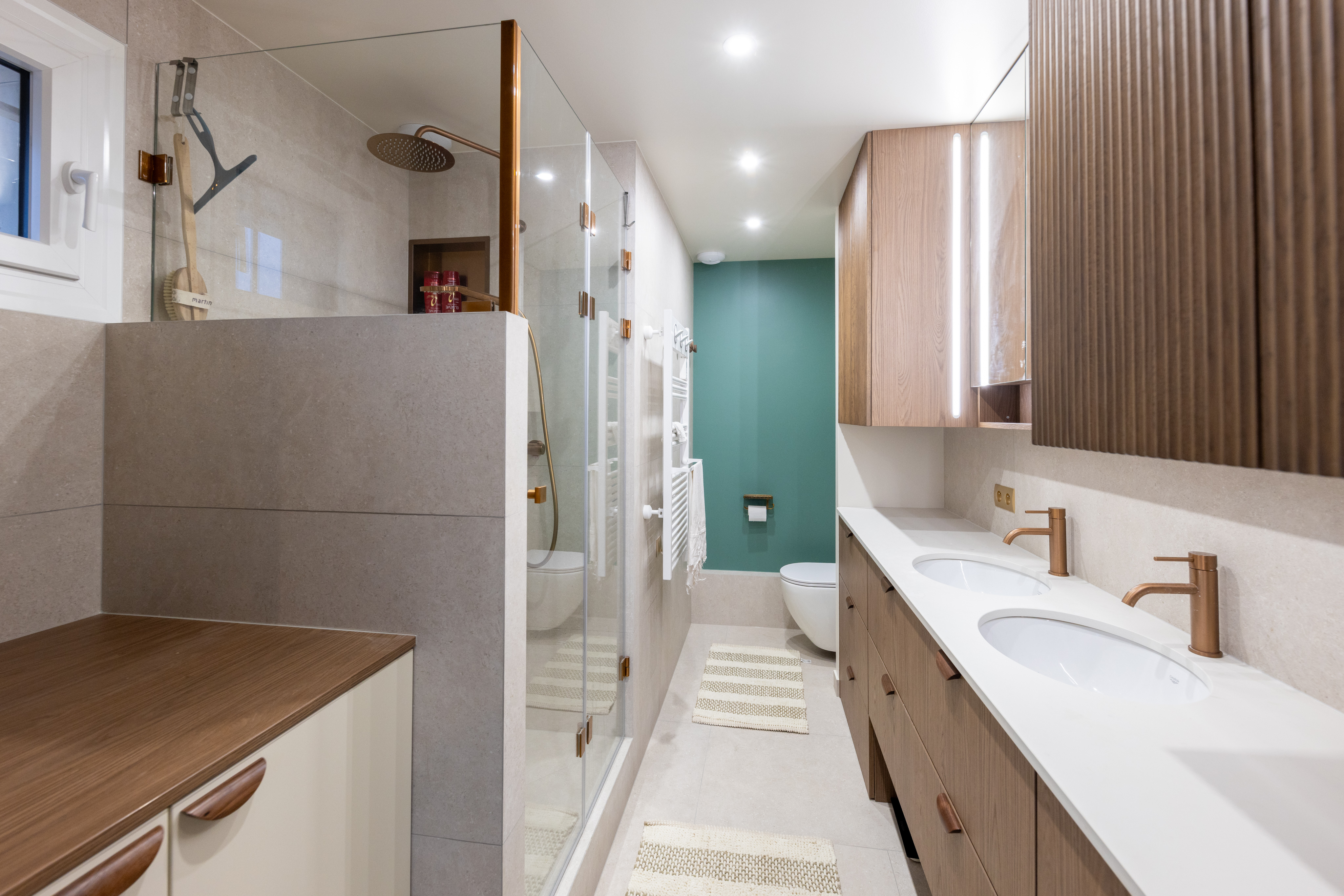 Le vert, couleur dominante des menuiseries sur mesure, fait écho à la végétation extérieure et apporte du rythme à l’espace. Il est subtilement contrasté par des touches de rouge, présentes dans les cabochons du sol et quelques aplats de peinture, qui apportent relief et caractère à l’ensemble.